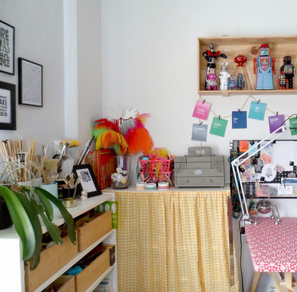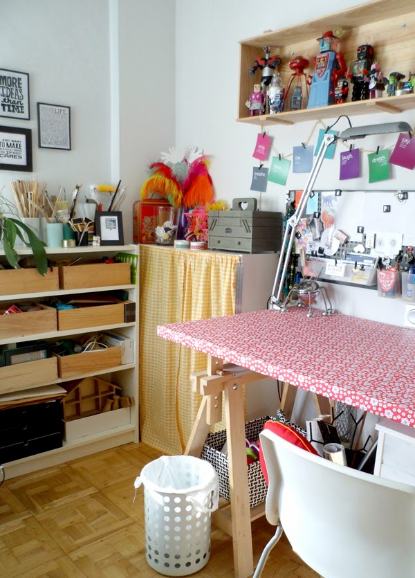 Abajo veis la foto del (casi) antes. ya está colocada la cortinilla de cuadritos vichy amarillos en la estanteria donde guardo los botes de pintura, barnices, colas... y aunque la otra se mantenía bastante en orden gracias a las cajas de vino de madera, preferí ocultar también todo de la vista y evitar tentaciones para la pequeña Sira.