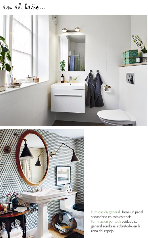Cuántas veces te has ido a mirar al espejo y te has dado tu mismo sombra, para que no pase esto, tenemos que poner los punto focales lo más pegado en la pared, y si es en la misma pared mejor, que mejor. Me encanta la idea de poner luminarias con brazos para moverlos según la necesidad de cada persona.