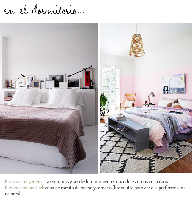 El dormitorio deberemos combinar la luz de lectura de la mesita de noche con la luz general y la luz de la zona del armario o vestidor.