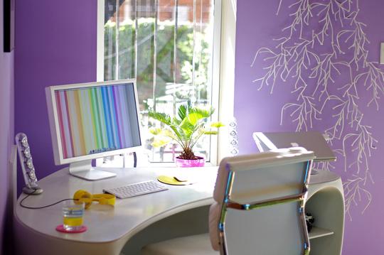 Decorar con púrpura la oficina pequeña es ideal para promover la creatividad y despertar nuestra intuición. Es un color que disminuye la angustia, las fobias y el miedo, por lo que para autónomos indecisos puede ser el más adecuado. Aunque también es el color de la ambigüedad, de lo inadecuado, de la vanidad, de la moda, de la magia, lo oculto, la fantasía....