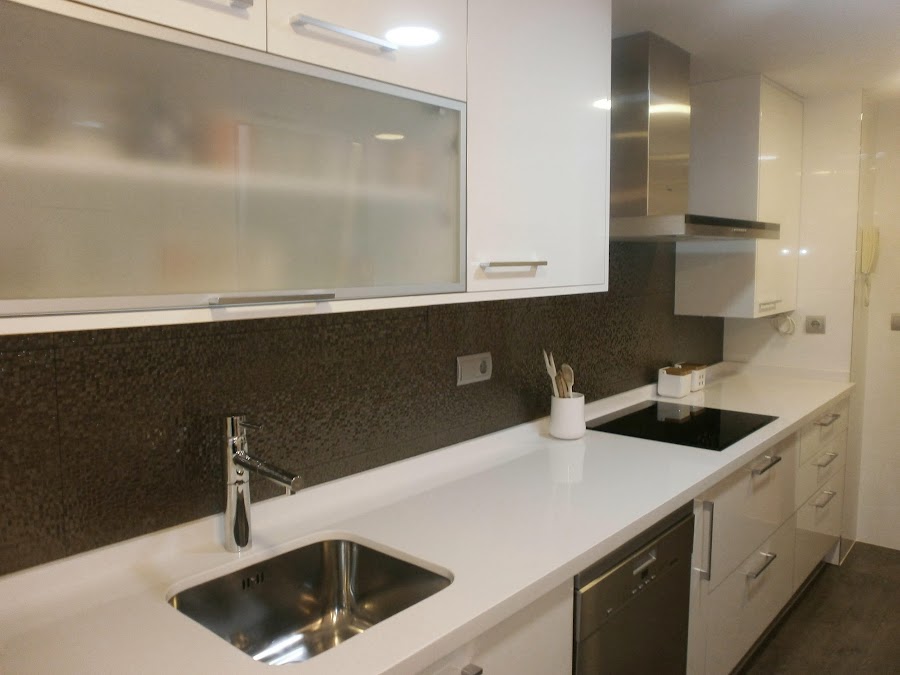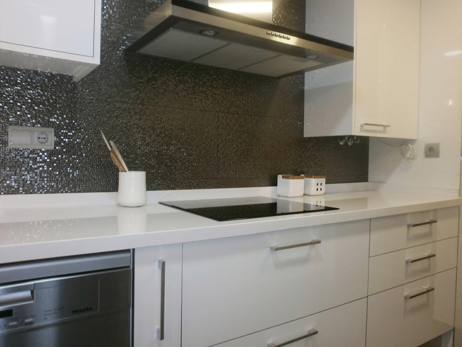 Es frecuente que las cocinas pequeñas den una sensación de ahogo por la irremediable falta de espacio y colores poco adecuados y el momento de reformar la cocina es una buena oportunidad para hacer algo al respecto. Una útil forma de lograr más amplitud visual es optar por un color claro como el blanco para muebles y encimera y un revestimiento negro en la pared frontal, con lo que se obtiene claridad y al mismo tiempo, más profundidad al ambiente. Si además el acabado es brillante, todavía mejor pues refleja la luz, como en ésta estupenda cocina, donde se ha elegido un material estratificado blanco brillo con los cuatro cantos de aluminio macizo y Silestone Blanco Zeus. Es una configuración lineal compuesta por una larga superficie de trabajo en una pared, con placa de inducción, campana decorativa plana de 90 cms., fregadero de acero inoxidable bajo encimera, lavavajillas y lavadora también de acero y se ha colocado el calentador en un mueble alto. Enfrente, la zona de frigorífico, horno, columna despensa, escobero y el indispensable espacio para la mesa de comer diario. Una solución práctica y actual.