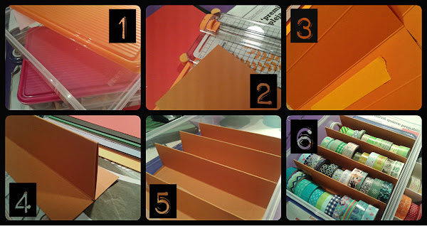 A mi me gustan mucho unas cajas de plástico, que se organizan muy bien en las estanterías y me sirven para guardar muchas cosas. Pues en ellas también guardo los washis, pero para que no queden dentro "bailando", me he dedicado a hacer unos separadores con cartulina de 270g. que quedan muy bien.