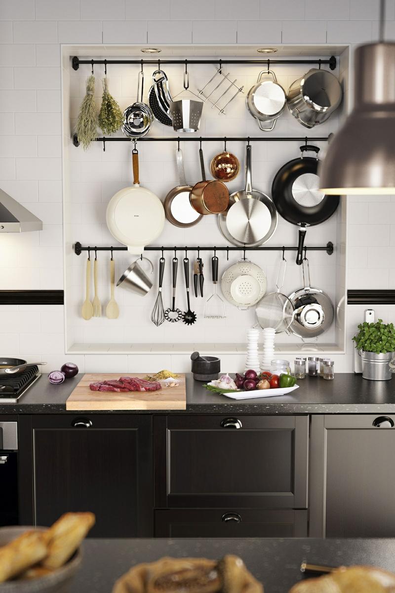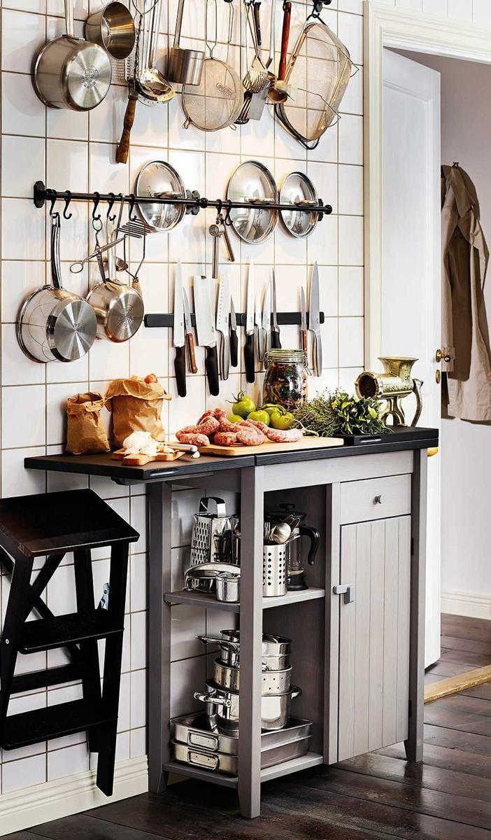 Fuente: pinterest Hay que buscar ideas ingeniosas para organizar las cocinas sin muebles altos. Una alternativa es añadir complementos ligeros que no añadan demasiado peso visual. Las barras con ganchos o paneles organizadores son perfectos.
