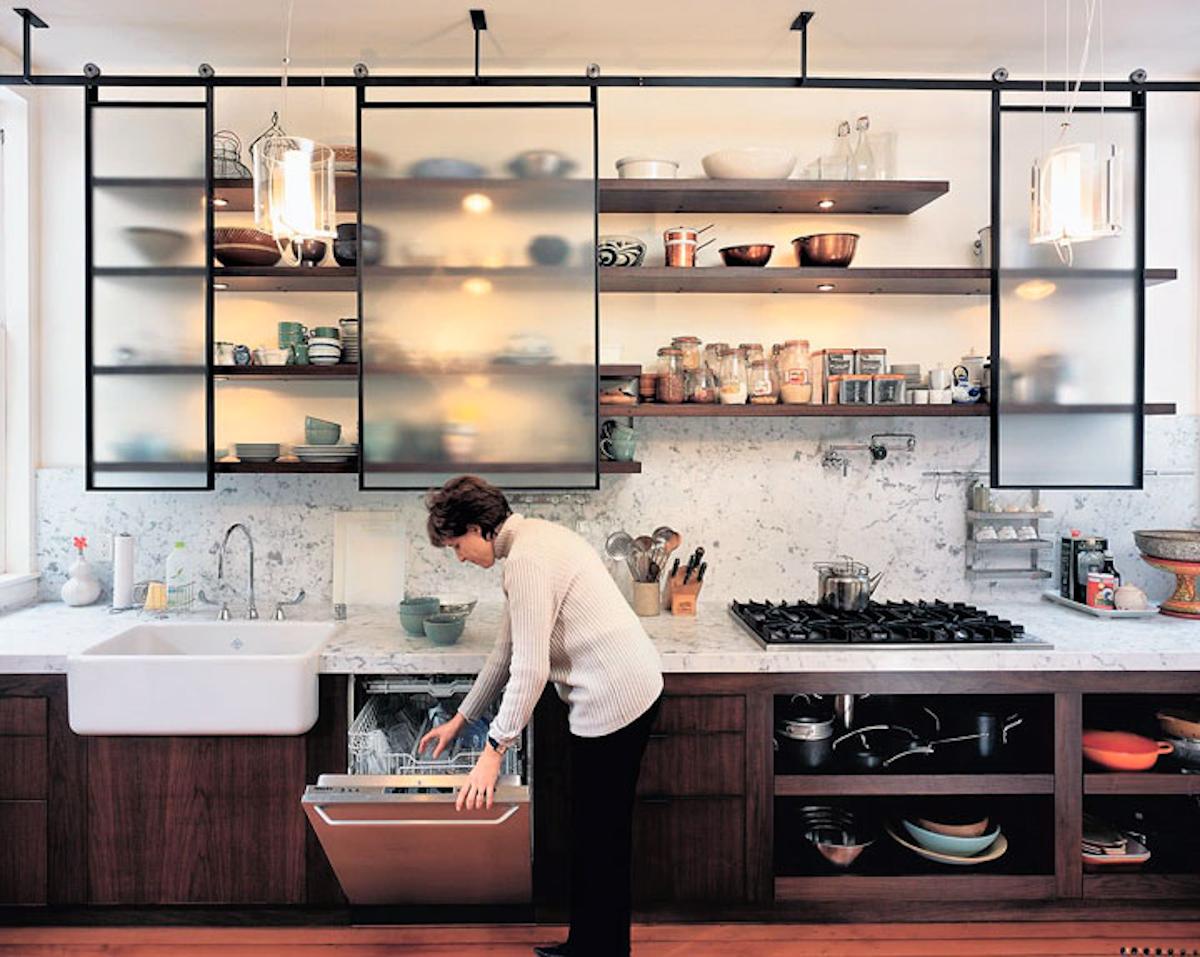 Fuente: pinterest Una solución práctica para evitar la suciedad y la grasa en los estantes es colocar puertas correderas de cristal. Con este sistema podrás desplazarlas fácilmente donde quieras. Al ser transparentes no tapan nada y se consigue el mismo efecto que el de los estantes abiertos.