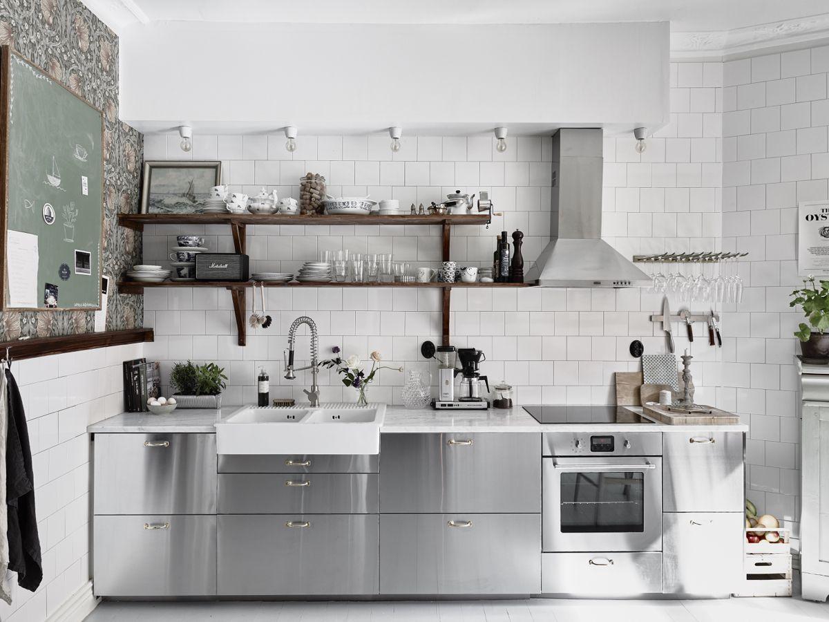 Fuente: pinterest Si lo que quieres es una cocina profesional, lo mejor es optar por una mobiliario de acero inoxidable, sin muebles altos y con elementos que le aportan calidez. Añade baldas de madera oscura, plantas, tablas de cortar