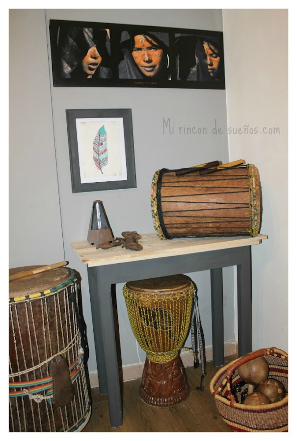 En la otra pared, está la mesa que transformé con un palet, y donde están los instrumentos.