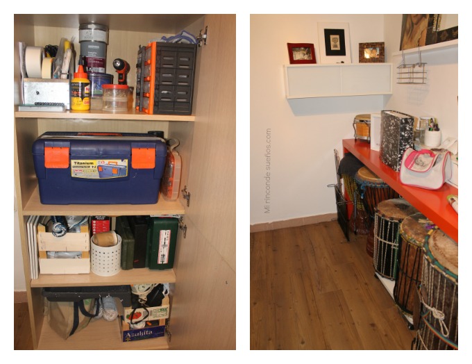 En el hueco, he puesto dos djembés y al lado el archivador que tenía blanco.