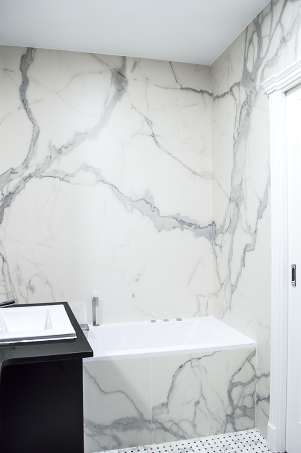 Para seguir con la armonía del diseño, el color y los materiales para el baño principal , mi propuesta fue el nuevo revestimiento porcelánico imitación de mármol. En la misma línea se hizo el baño de los invitados pero con un porcelánico negro, pero esta vez combinado con un mosaico de Porcelanosa para la zona de la ducha.