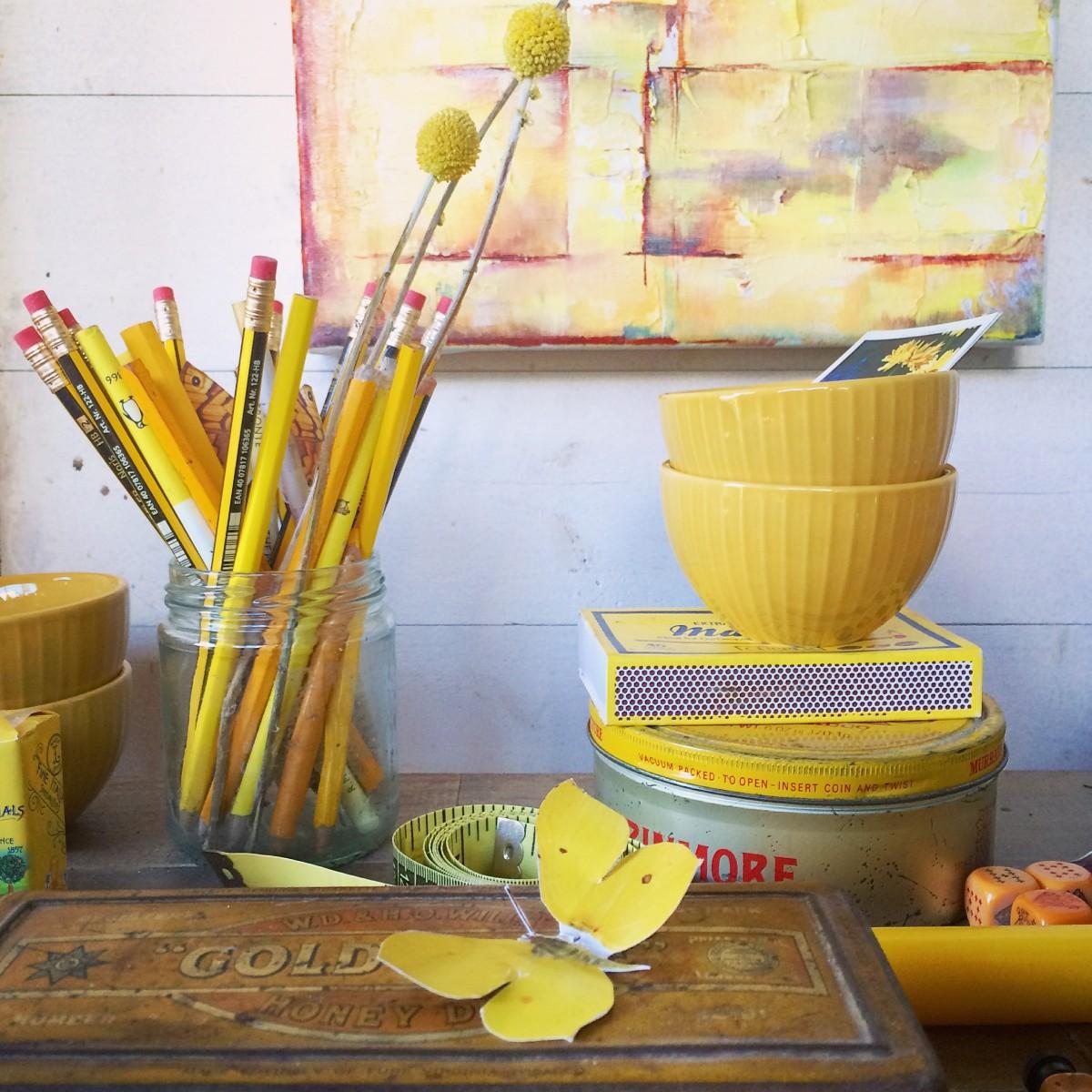 Rodeada de sus colecciones vintage ,algunas realizadas con objetos de herencia familiar y otros adquiridos en mercados de pulgas combinados con objetos nuevos como la lámpara amarilla. Punto de partida de esta transformación.