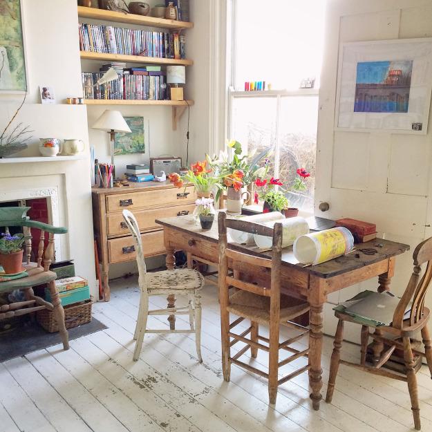 No tiene uno que ser una artista profesional para crear un espacio creativo como este,ni tener un coberizo. Un rincón de la casa o si dispones de espacio suficiente una habitación con luz natural vendrá bien.Ya has visto donde realiza las fotos Philippa en una mesa.Si tienes alguna afición,estos días de vacaciones son ideales para darle un nuevo aire a tu pequeña guarida creativa y dejar volar tu imaginación .Disfrutar de la céramica ,el macramé, las manualidades ,la costura ,la pintura o cualquiera que sea tu hobby.