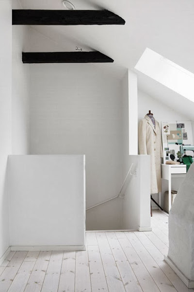 El espacio en lo alto de la vivienda, en la buhardilla mas angosta, es un pequeño estudio de moda. Con una pequeña simbología del trabajo, busto y maquina de coser, nos dejan imaginar como la creatividad no solo disfruta en este espacio.