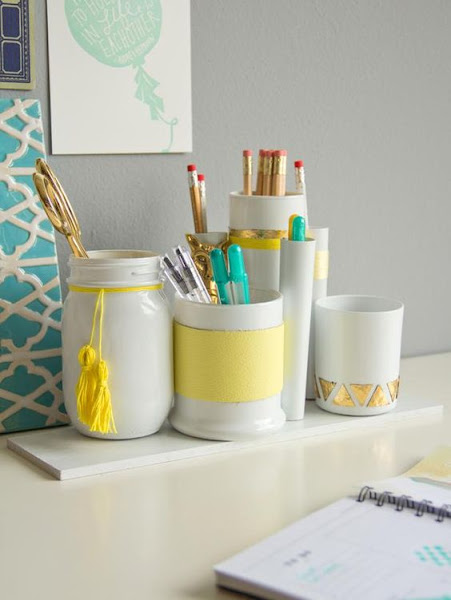 Cubiletes para organizar los bolígrafos y lápices. Puedes hacerlos tu mismo, reciclando materiales como botes de conservas, latas, cuellos de botella, tuberías... Solo tienes que cortarlos a la medida que te guste y pintarlos o forrarlos de tela. Recuerda pegarlos a una base para que no corran peligro de caer.