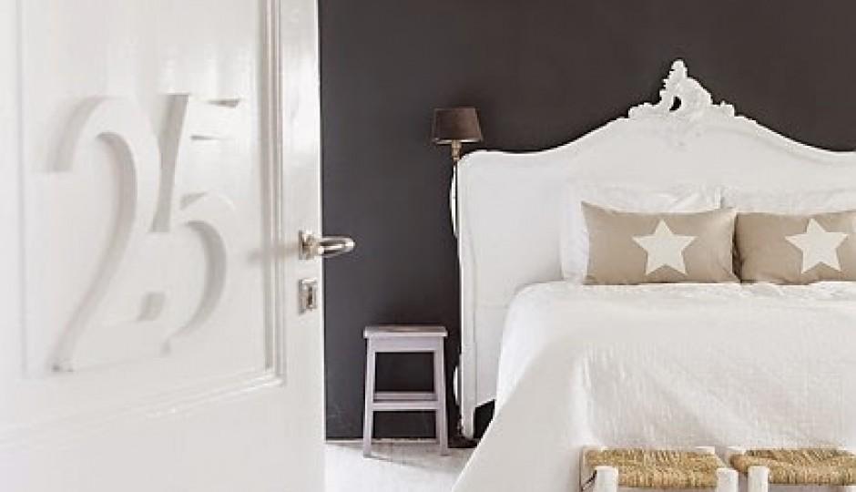 Una pared negro grafito hace resaltar la decoración sencilla de la estancia y da protagonismo al cabecero de estilo Luís XV de líneas curvas,contrasta con la simplicidad del conjunto
