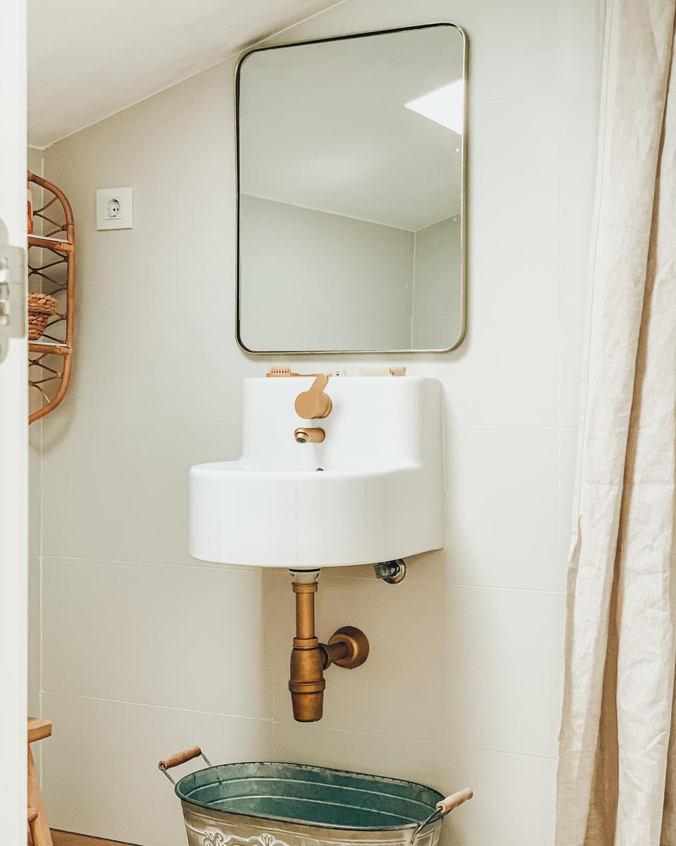 Se trata de un espacio que lleva años bastante desaprovechado, porque al estar dos plantas más arriba de la principal no subimos casi nunca. Empecé la transformación subiendo nuestro sofá de Ikea con las fundas de lino radiantes pero poco prácticas para el día a día, pero en cuanto nos llegó la columna de ducha termostática Loop Oro (_COTE001BG) de Sanycces tuve que dejarlo todo para que este mini baño de tan sólo 3 m2 estuviera a la altura de semejante maravilla.