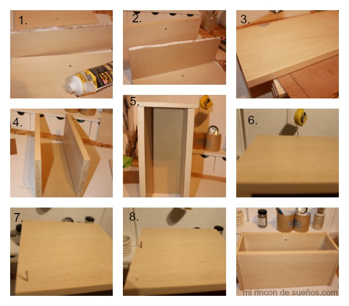 Una vez presentado todo, lo abrimos y empezamos a encolar las piezas. He empezado , por lo que sería la base, y la cara principal (Foto 1 y 2)Al tener agujeros la madera, (ya que era parte de la estantería del cd) colócala dentro para que no se vea.