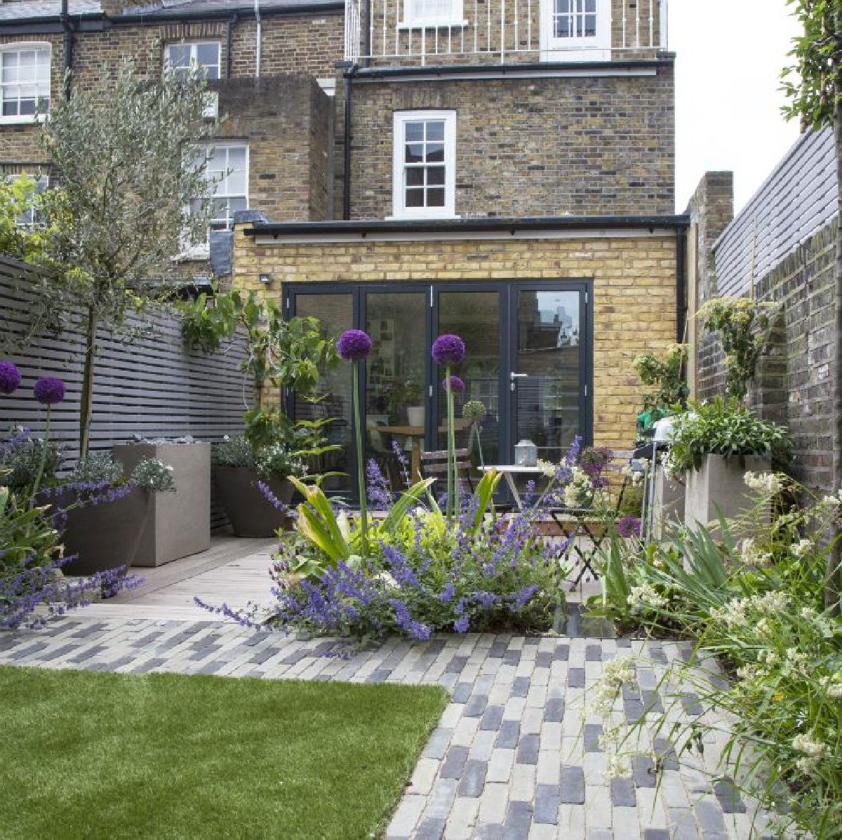 Una de la manera de diferenciar distintas áreas en un patio pequeño, es utilizar diferentes materiales.