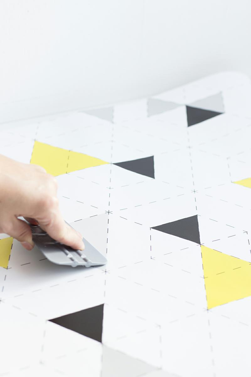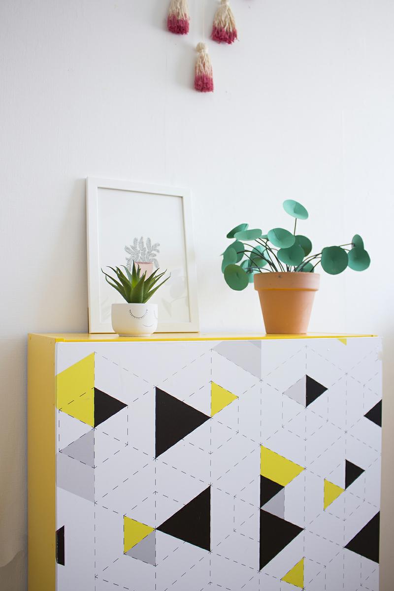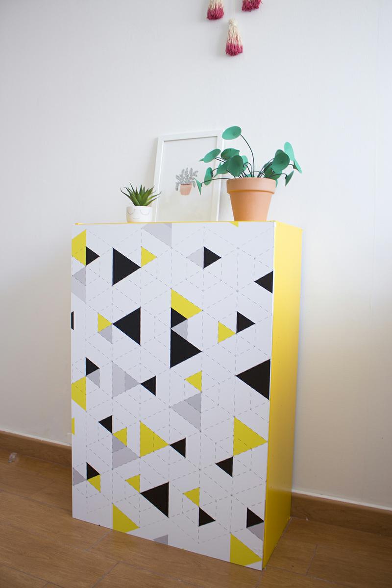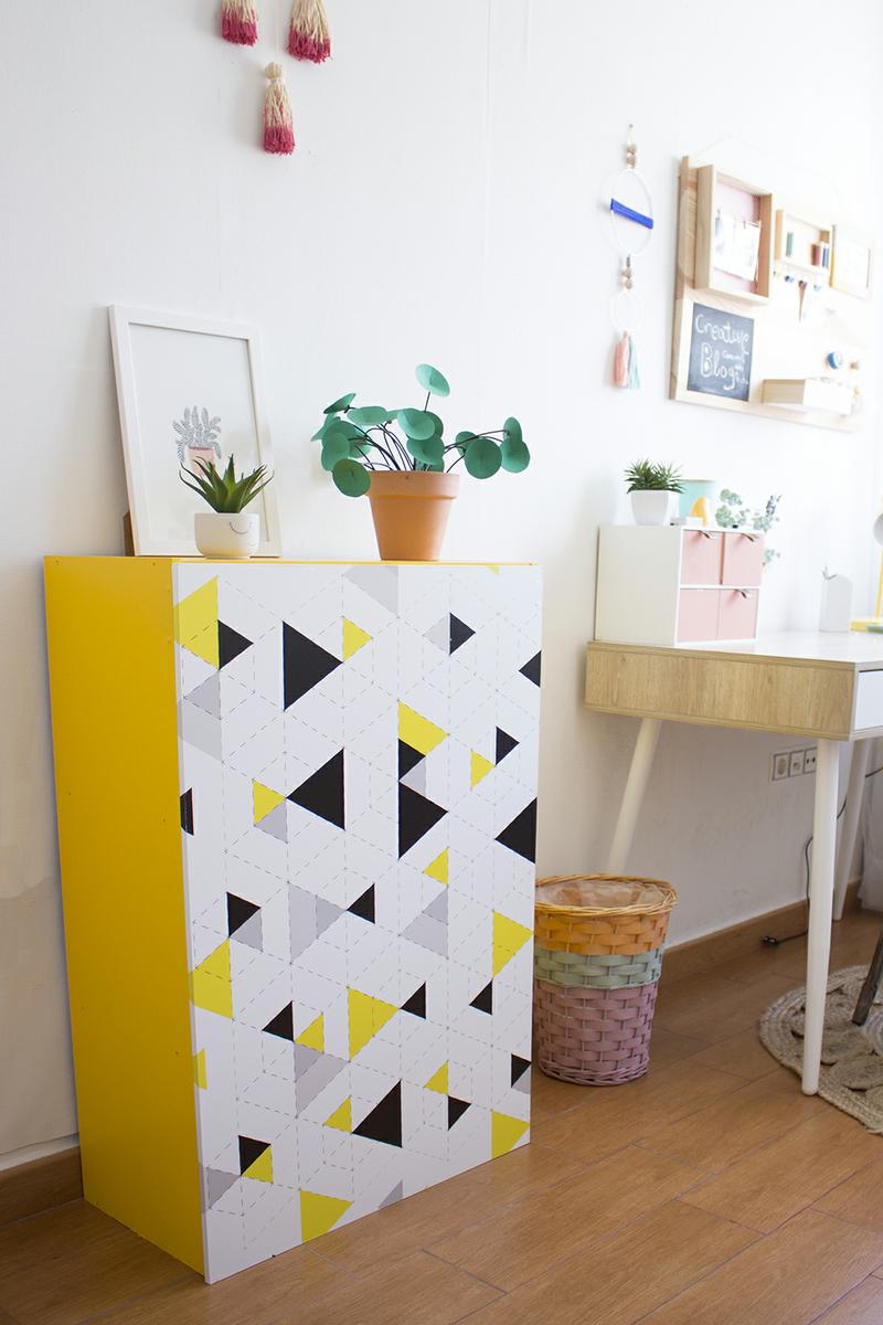Mientras la pintura seca forramos la tabla de madera con el vinilo que servirá de puerta. Por ultimo colocamos las bisagras y los cierres magnéticos y ya tenemos listo nuestro nuevo aparador.