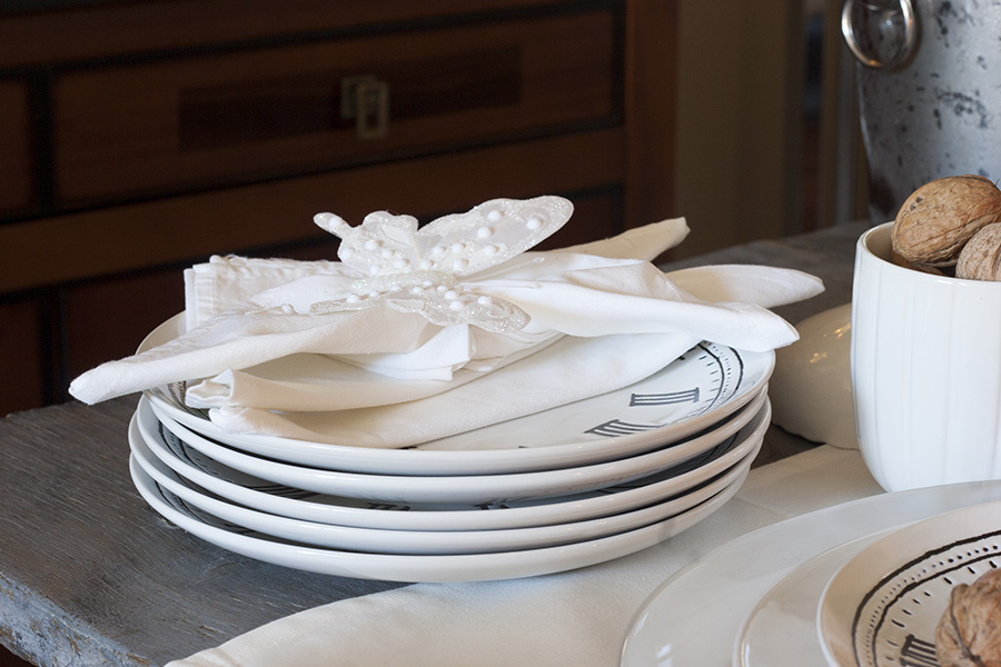 No tenéis porque usar servilleteros comprados ¡Podéis hacerlos vosotras! En este caso hemos usado unas mariposas blancas, unos adornos navideños como los que decoran el árbol, para homogeneizar así la temática decorativa de ambos ambientes: árbol navideño y mesa festiva.