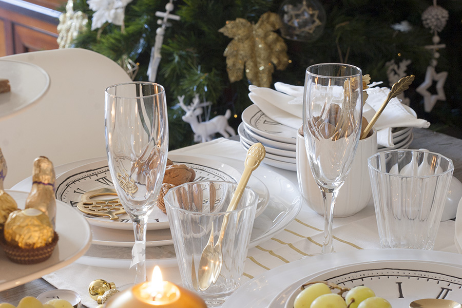 Y es precisamente por esta pieza, el plato reloj, por la que hemos empezado a construir nuestra mesa de Nochevieja. Normalmente es así como se empieza a diseñar, partiendo de un elemento inicial: unos platos, ese mantel que te regaló tu abuela, unos vasos de relieve de color, unos candelabros...