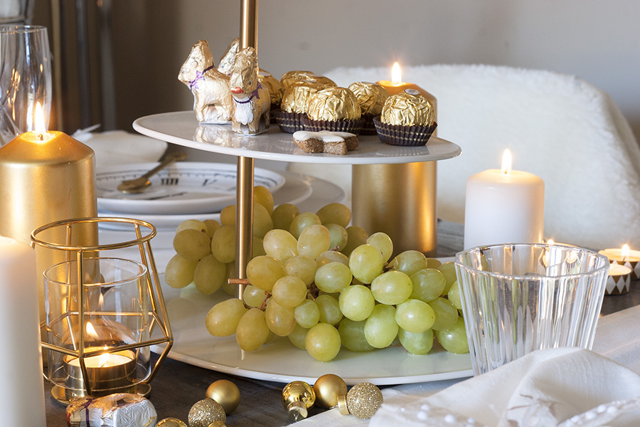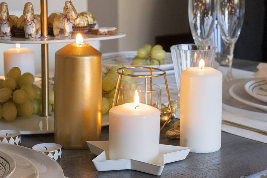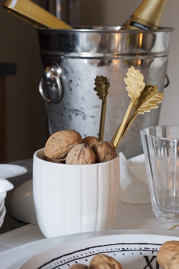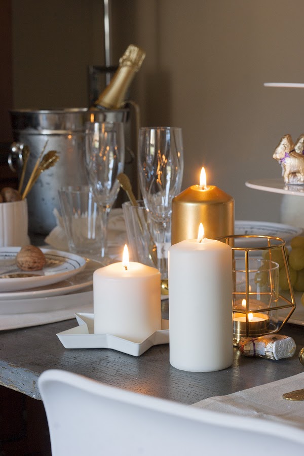 La idea inicial para decorar esta mesa de Nochevieja fue colocar el camino de mesa en el centro y hacer una fila enorme de velas a distintas alturas y colores... ¡Me vine de Ikea cargada de velas blancas y doradas súper bonitas! Y al final me di cuenta de que si ponía velas, ¿dónde pondría las uvas, por ejemplo? Queremos una mesa festiva bonita y vistosa pero también cómoda verdad? ¡Seamos prácticas!