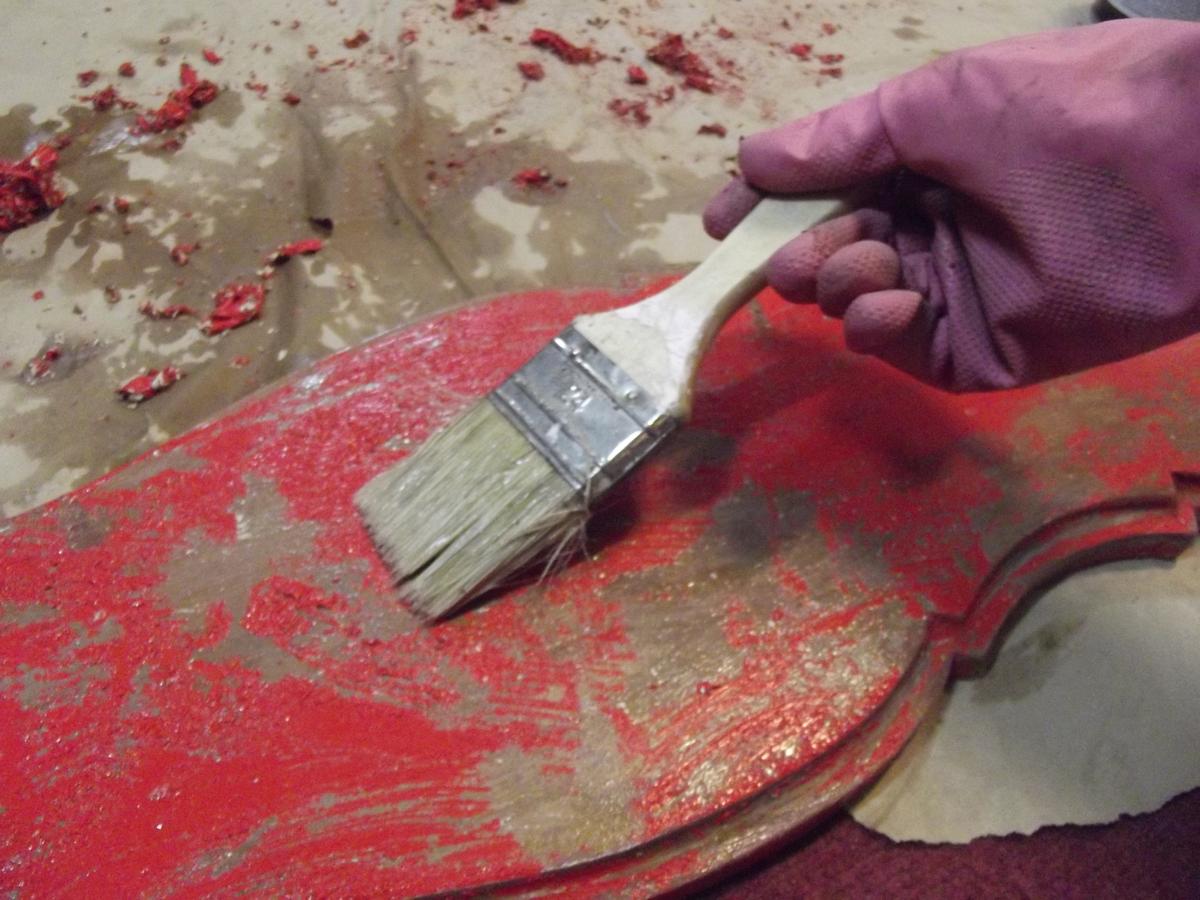 En foto superior se puede apreciar el efecto del decapante sobre la pintura original. Tuve que aplicar dos capas. En la imagen inferior se muestra como aplico la segunda. En este caso el producto funcionó muy bien pero dependiendo del tipo de pintura, hay que aplicarlo hasta cuatro veces y después lijar.