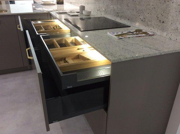 Guías de los cajones y gavetas. EL sistema de guías ofrece comodidad de movimiento, aportando un deslizamiento ultraligero y una carga dinámica entre 30 kg a 65 kg. Gracias al sistema de amortiguación, el cierre suave y silencioso está garantizado durante toda la vida del mueble. Asu vez, cuenta con componentes perfeccionados en el perfil y en la guía de cuerpo del mueble, mejorando el deslizamiento ultraligero y proporcionan una sensación de suavidad incluso mayor. Además de un factor estético contando con el diseño interior del propio cajón o gaveta, con el frontal en cristal, en aluminio, madera…..