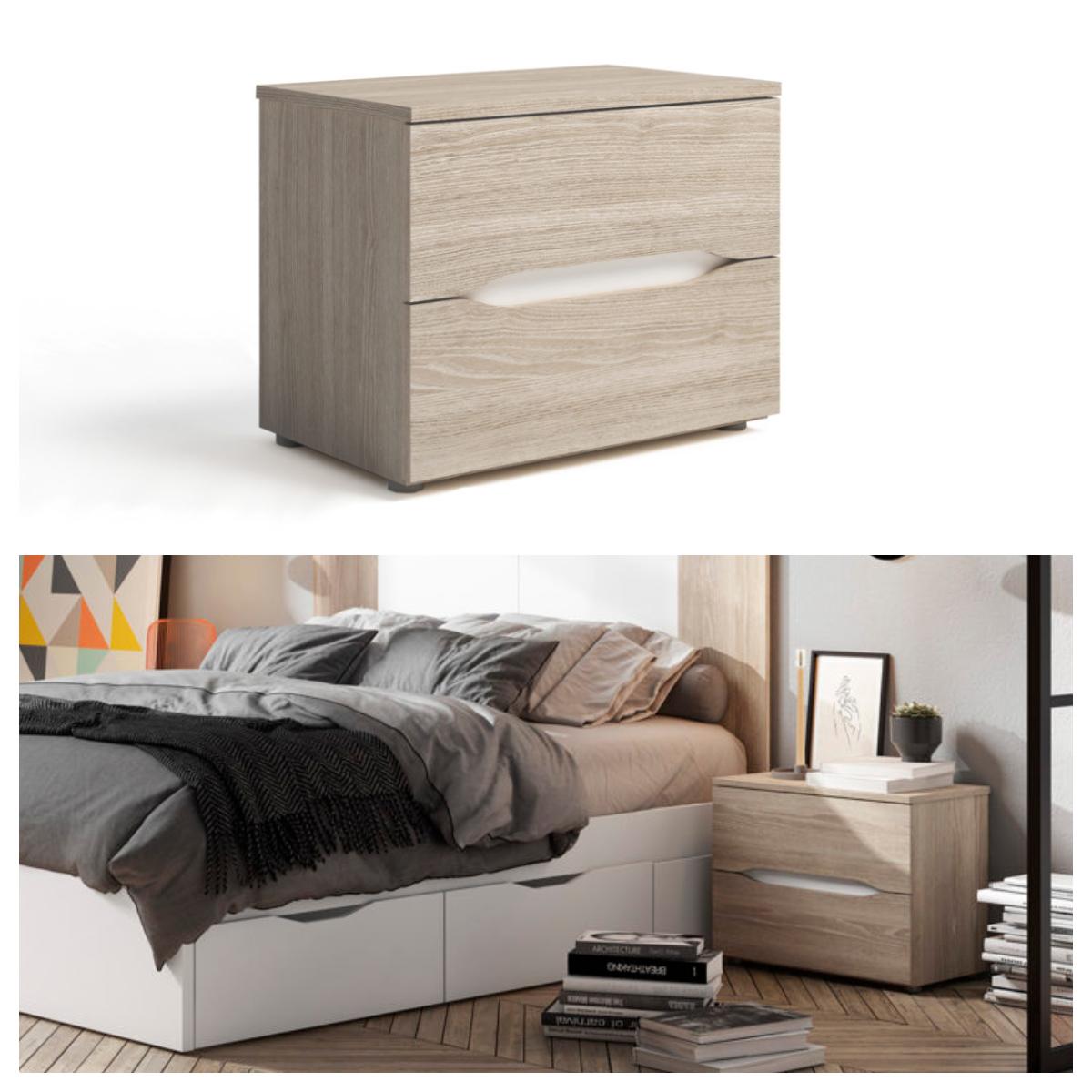 De igual modo, las mesitas de noche altas sin patas lucen perfectas dentro de espacios con estilo minimalista, tal como ocurre con la mesita de dos cajones Forseti, la cual cuenta con un diseño totalmente discreto y lineal.