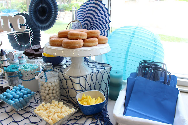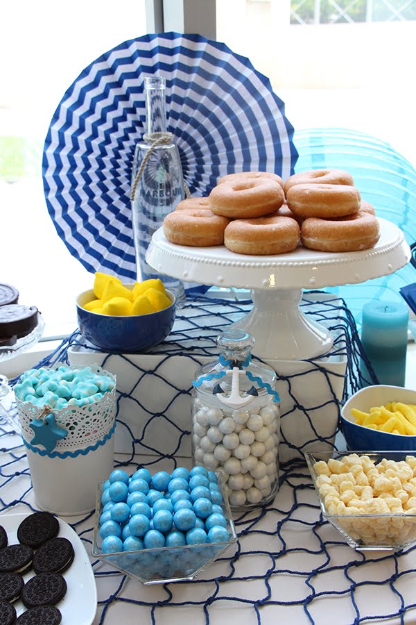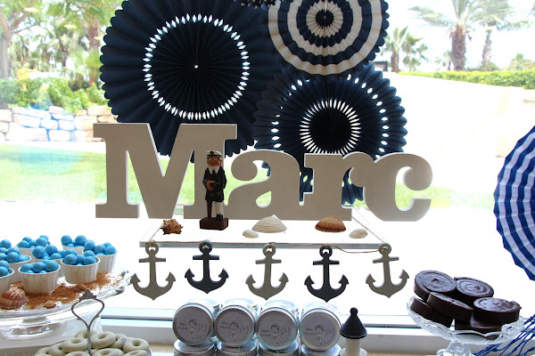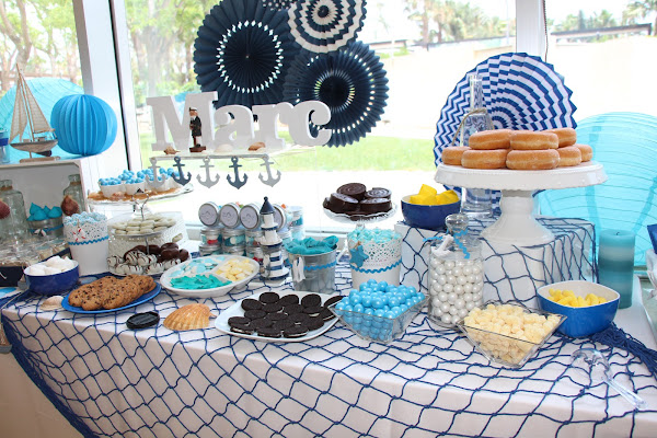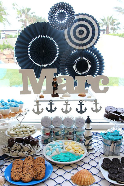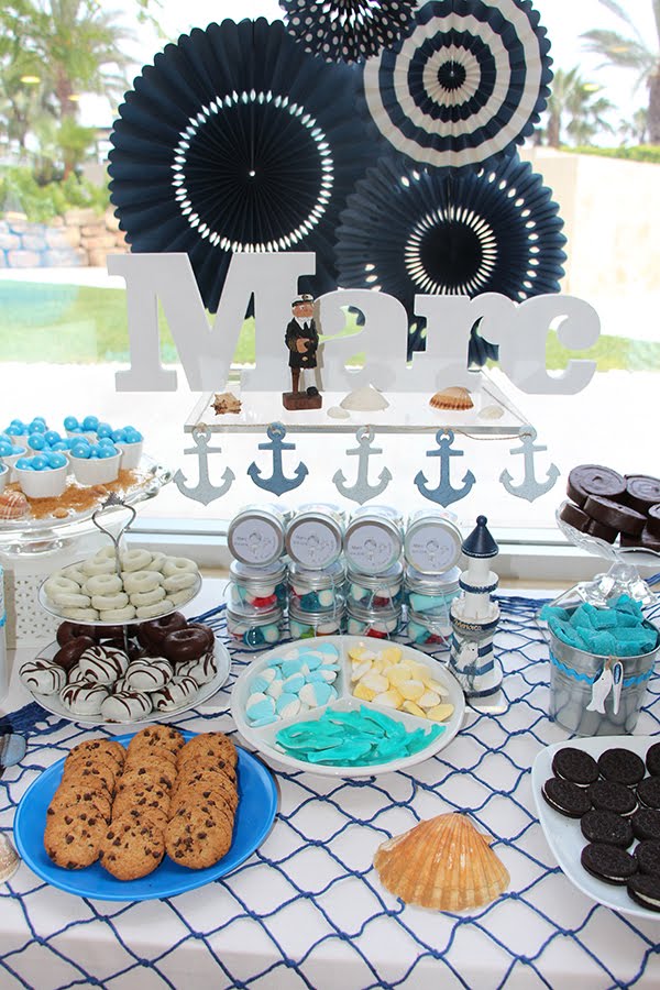Decoré la mesa con un barco, estrellas de mar, conchas, anclas, un faro, un marinero y varios elementos náuticos que nos transportaban directamente al mar.