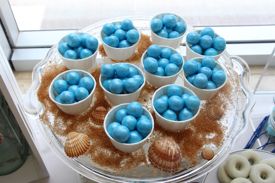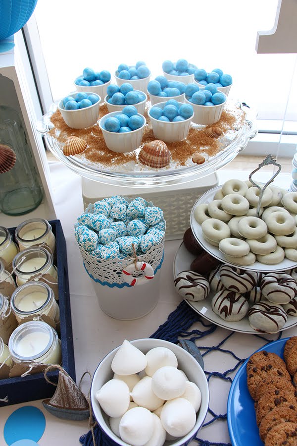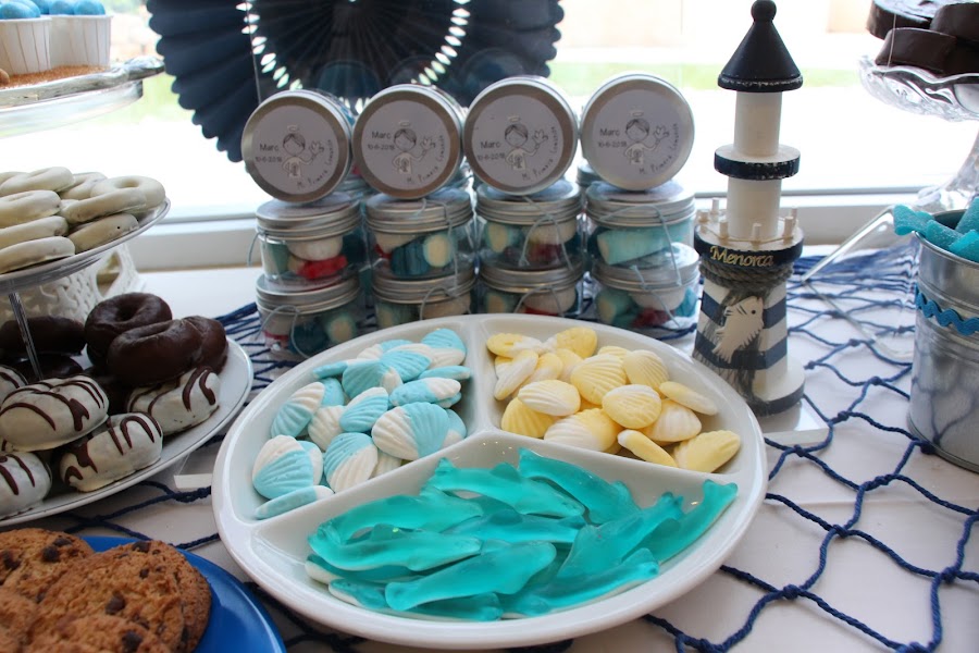 Hay tantas chuches de temática marinera que ayudan mucho a que todo esté cordinado, tiburones, conchas, estrellas de mar..., muchas golosinas en azul acorde con el color de la mesa.