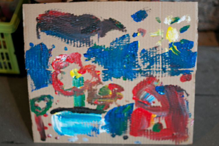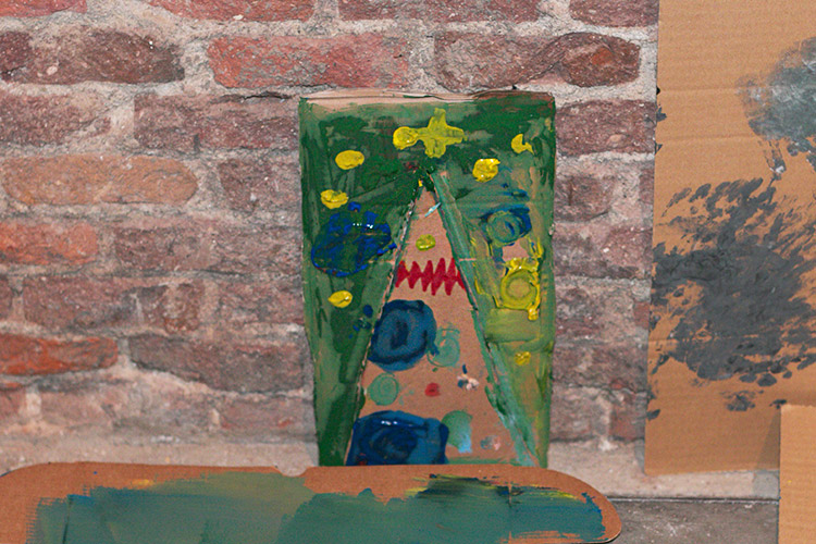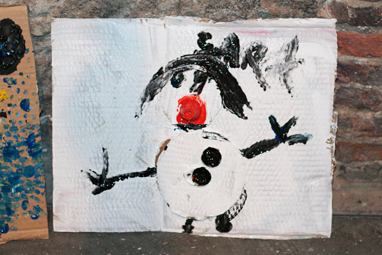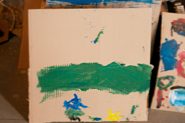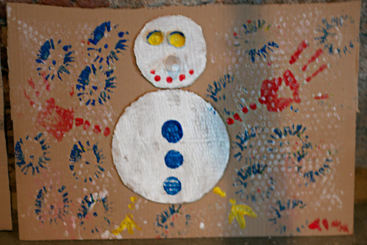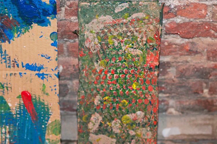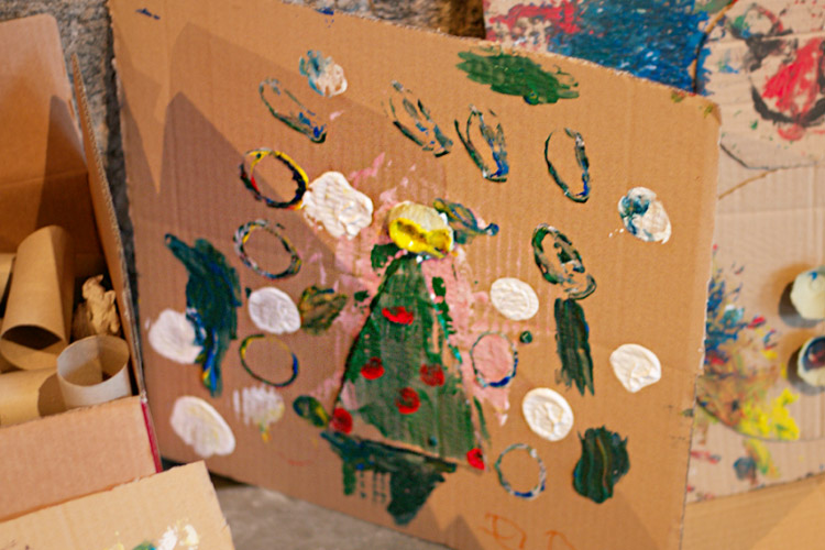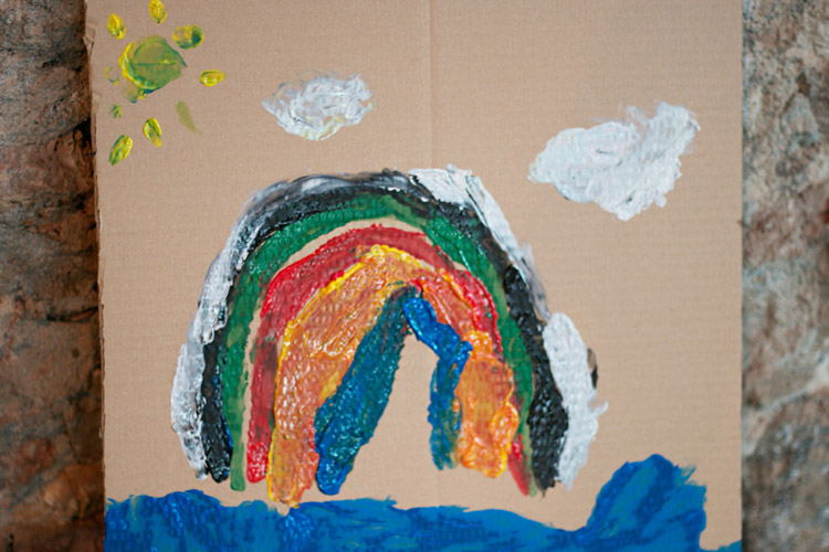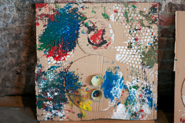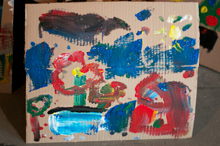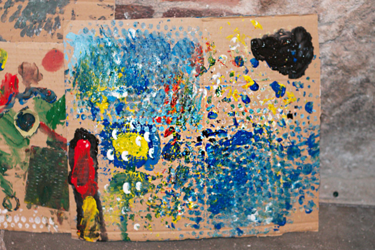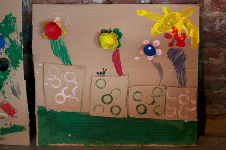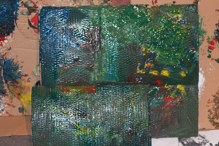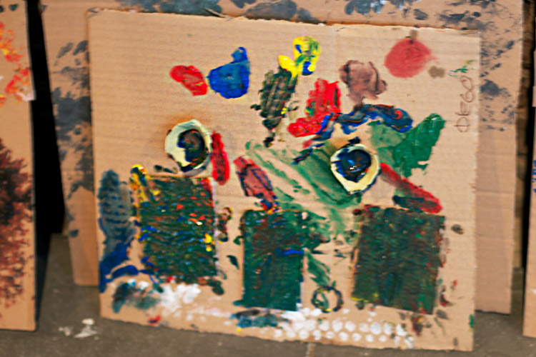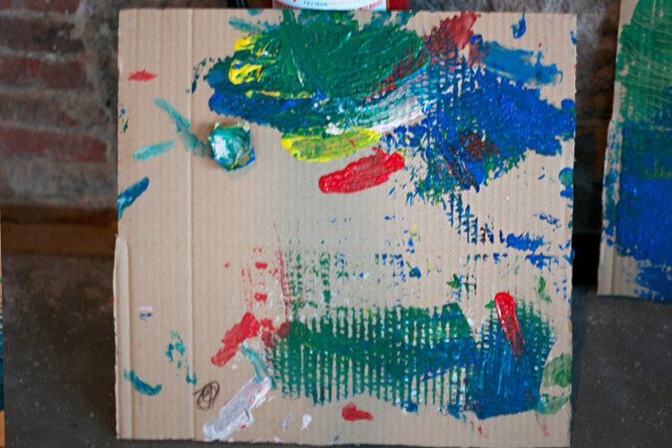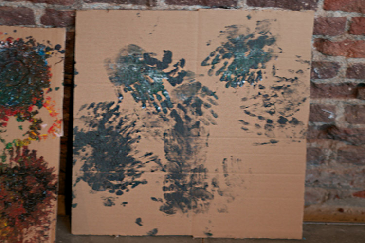 Yo me quedé con los más enanos. Usando pintura de dedos (madre mía, cómo se lo pasan con eso) un cartón como lienzo, sellos y rodillos para estampar con elementos reciclados y relieves con más cartones ¡o lo que fuera! Crearon una graaaaaaaan galería de arte (click para ver sus obras en grande):