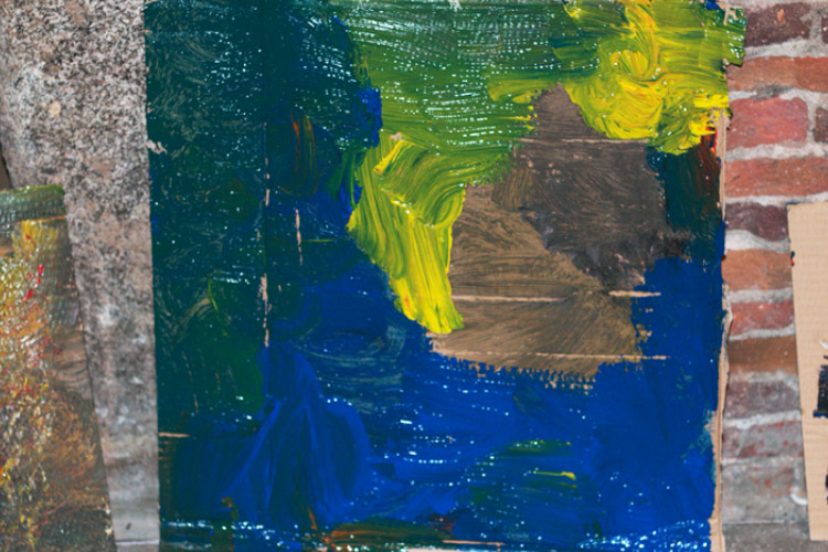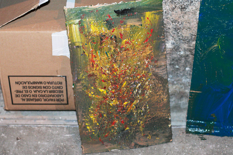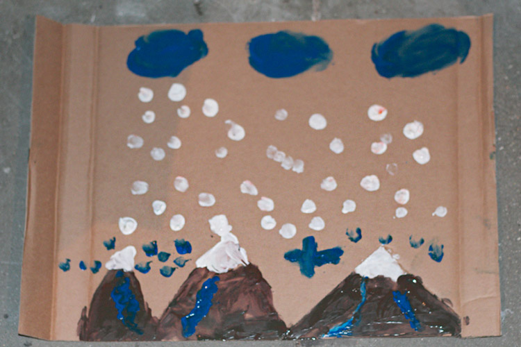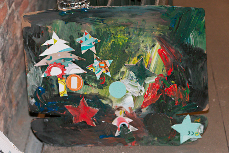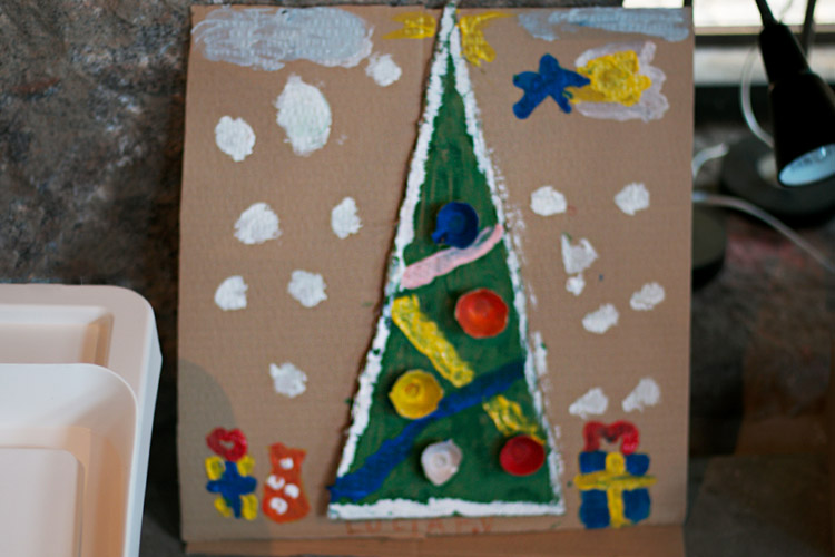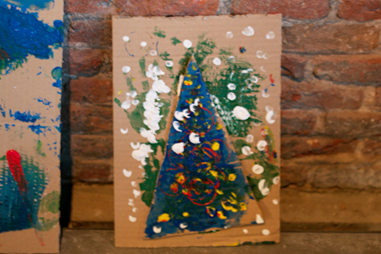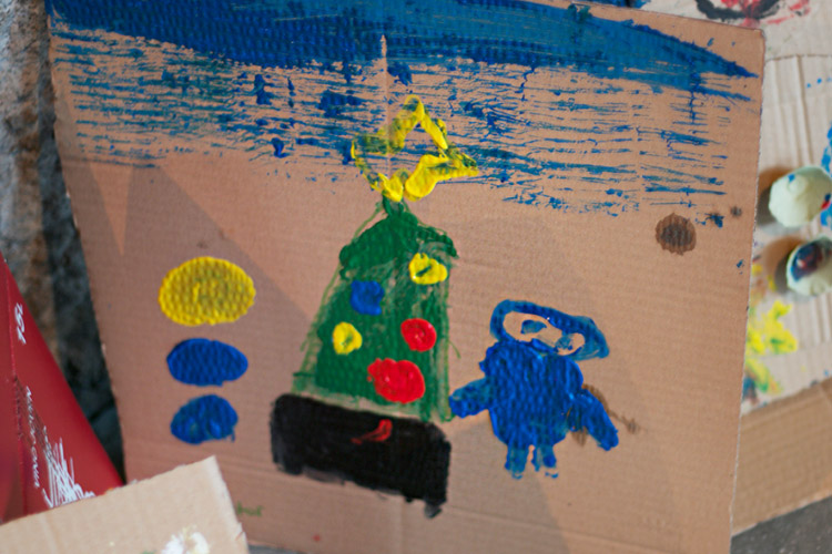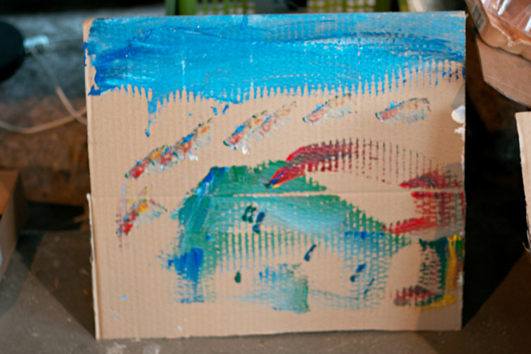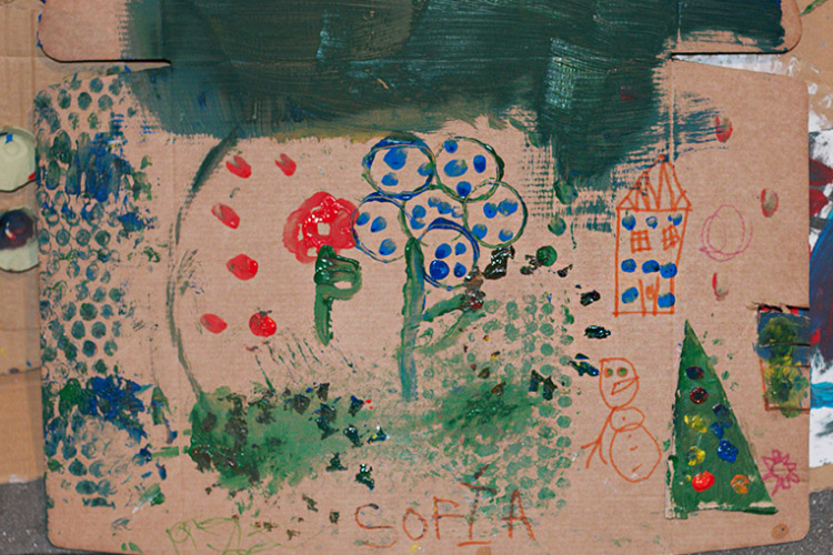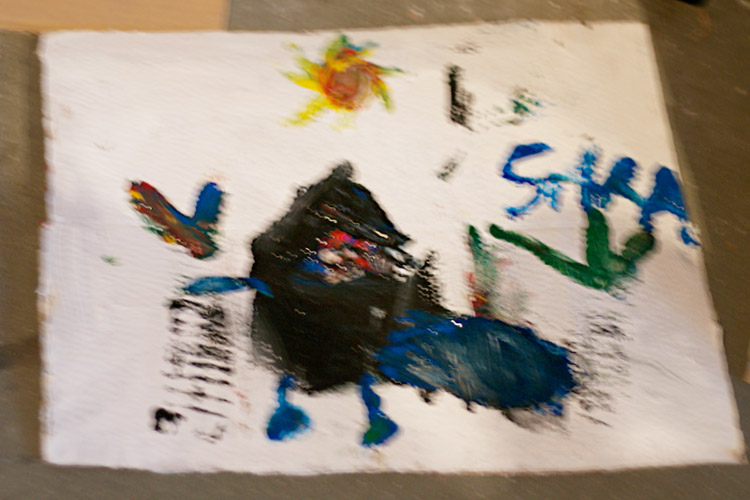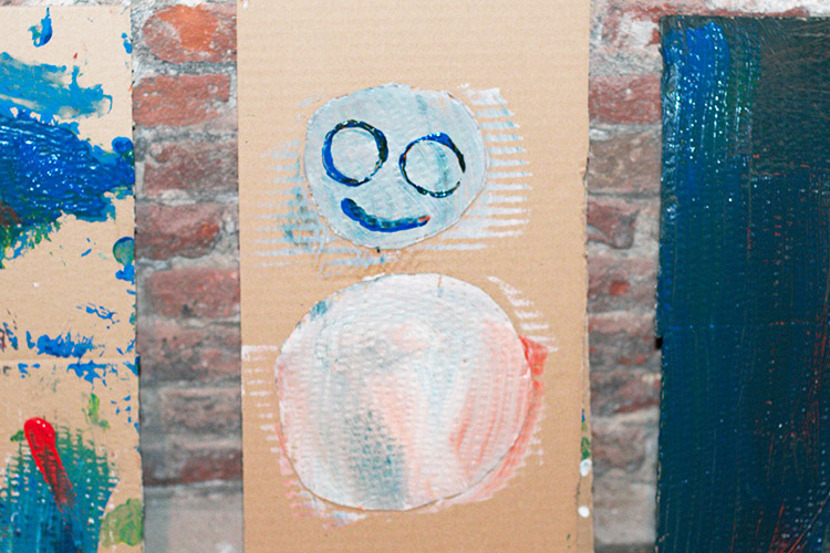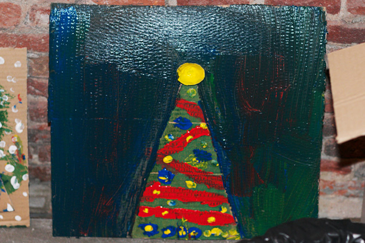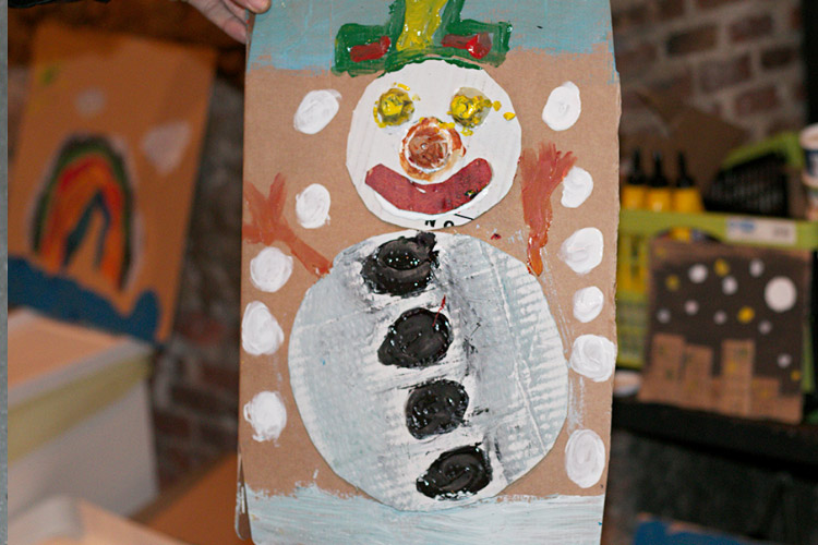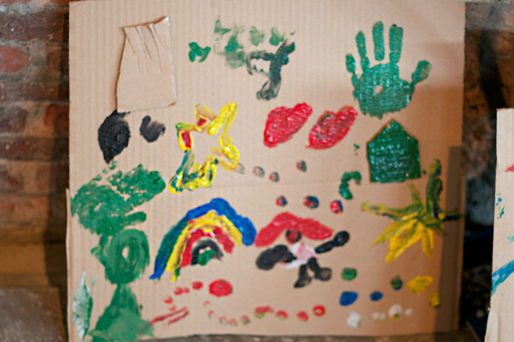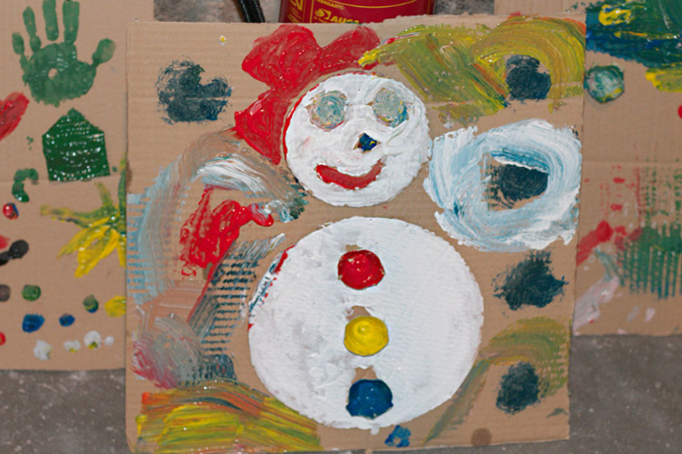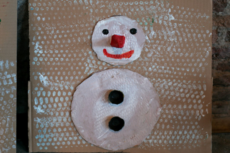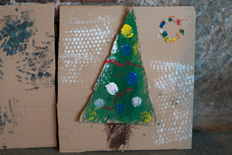 Yo me quedé con los más enanos. Usando pintura de dedos (madre mía, cómo se lo pasan con eso) un cartón como lienzo, sellos y rodillos para estampar con elementos reciclados y relieves con más cartones ¡o lo que fuera! Crearon una graaaaaaaan galería de arte (click para ver sus obras en grande):