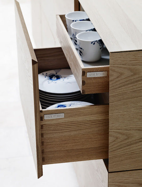 Form45 roble natural. Detalle del frente de los cajones y su acoplamiento con la encimera con el canto biselado invertido.