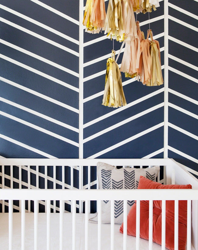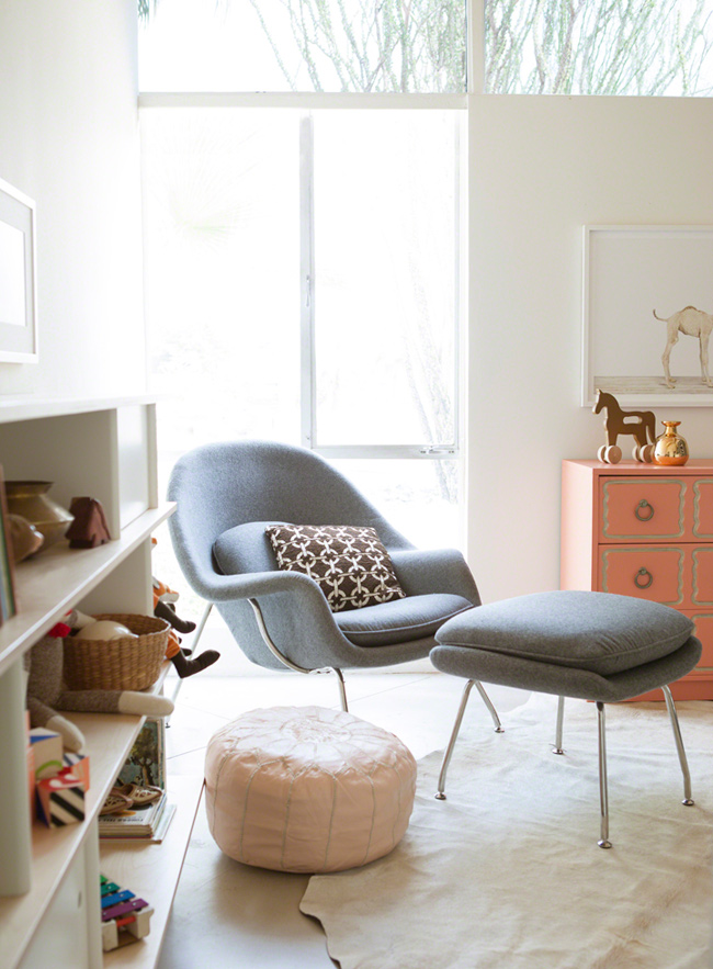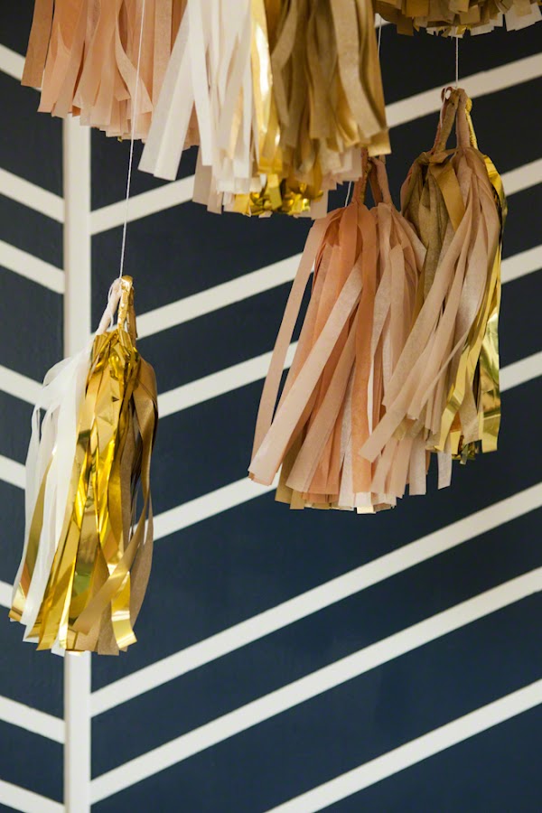 Una combinación poco usual, pero con una capacidad enorme de atraer nuestra mirada, gracias a los pompones en tonos dorados y salmón, que combinan a la perfección con la lámpara vintage y la cajonera reciclada de la que estoy enormemente enamorada.