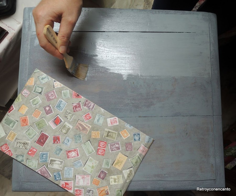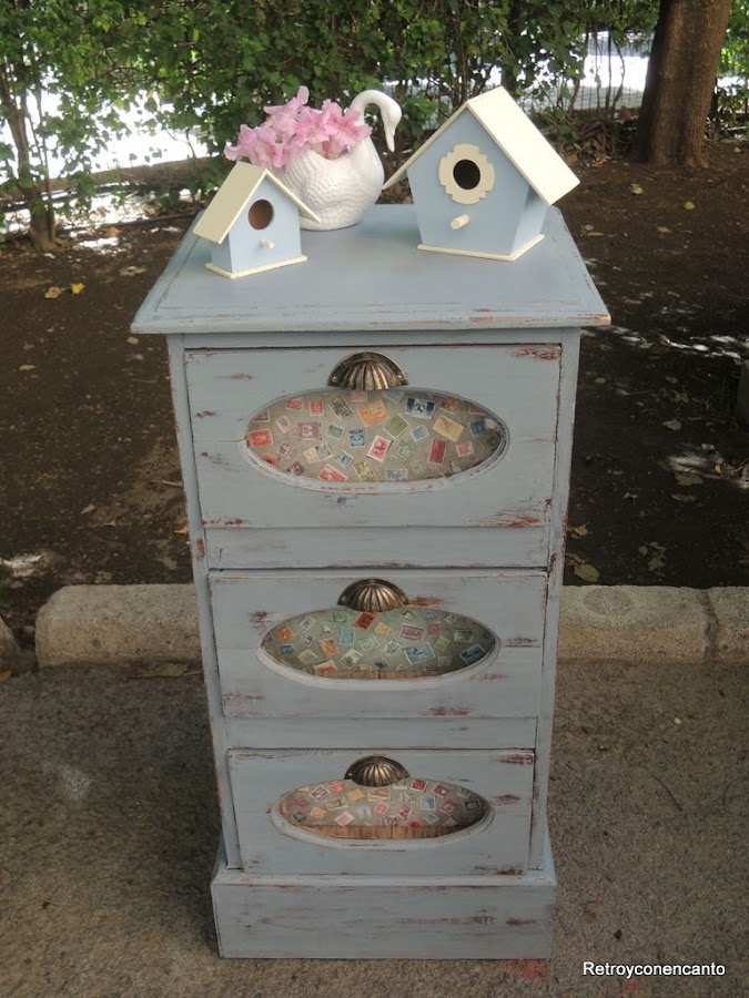 Nuestra amiga escogió está tonalidad gris báltico para el exterior del mueble, y el resto lo dejó a nuestra elección. Un papel de sellos sirvió de punto de unión con el interior....