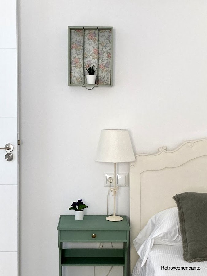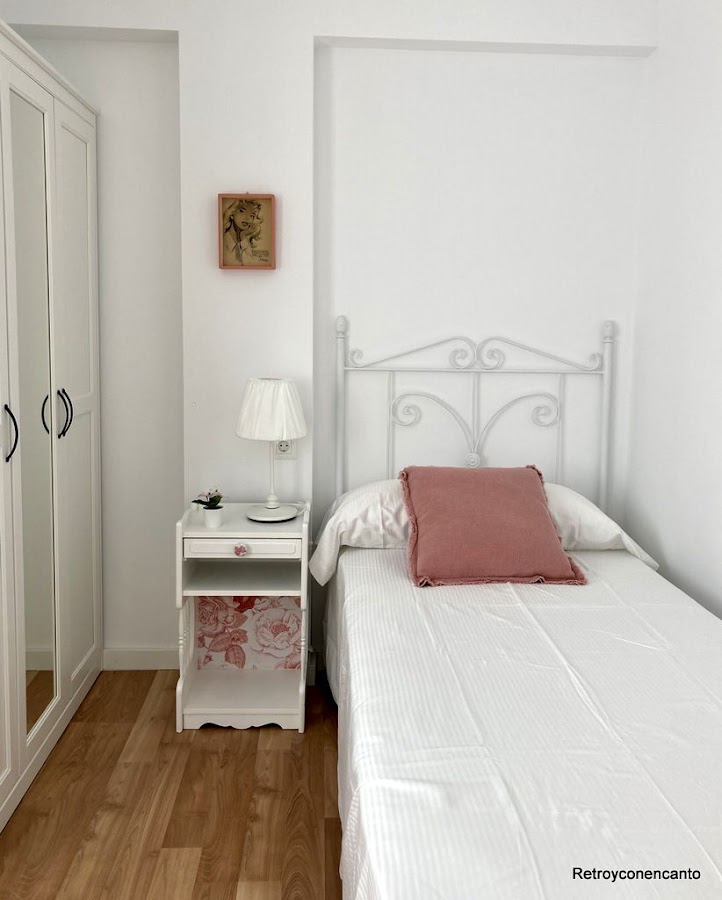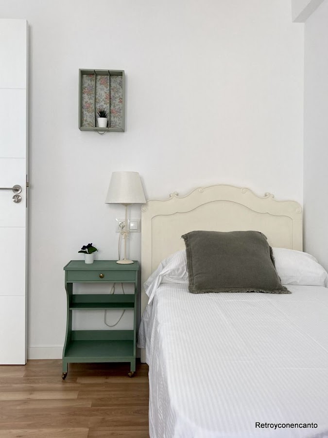 La aportación Retro y con encanto para el último cuarto está en el cabecero y en la cajita que decora la pared...,