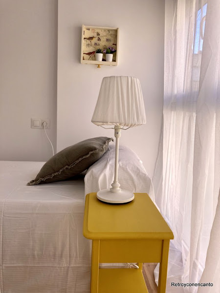 Con los muebles y detalles que teníamos en el taller fuimos haciendo diferentes composiciones que, al final, terminarían determinando el nombre que se le ha dado a cada habitación. Esta primera, os imaginaréis que es la amarilla... La mesilla y el cajón en la pared marcan la diferencia con el resto del mobiliario, que se repite en todas los cuartos.