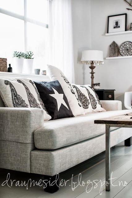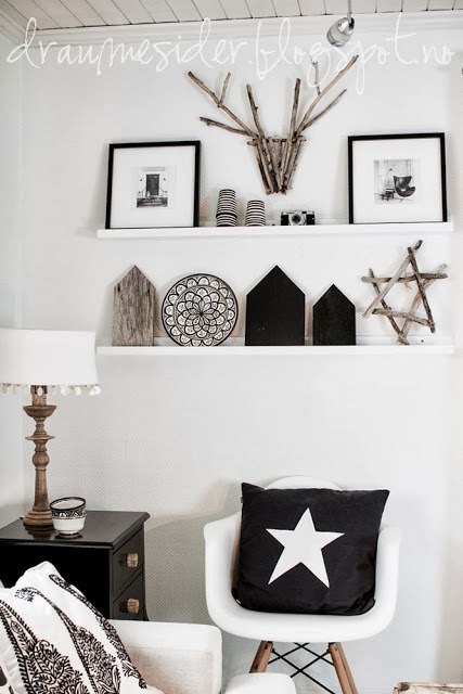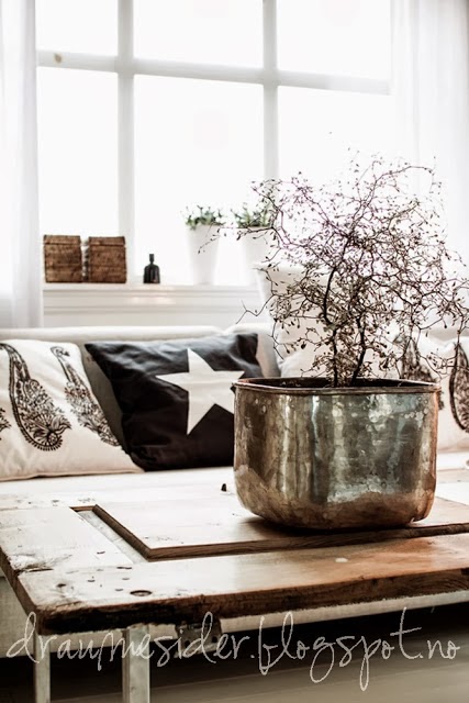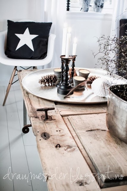 Es el centro de atención del salón de estilo nórdico de Elin de Draumesidene. Utilizó una vieja puerta que seguramente los demás hubieramos tirado para crear una mesita de sofá rústica y llena de carácter. Pero además del trabajo de reciclaje lo que más me gusta es como ha logrado que se funda en la decoración de su salón. Un salón, por cierto, decorado para la Navidad pero de una manera especial. Ha prescindido de los típicos abalorios de colores, bolas, colgantes, guirnaldas, y le ha impreso su sello personal. Una forma muy sutil de celebrar la Navidad, con detalles y accesorios naturales, que parece que pasan desapercibidos pero que le imprimen una fuerte tradición nórdica.