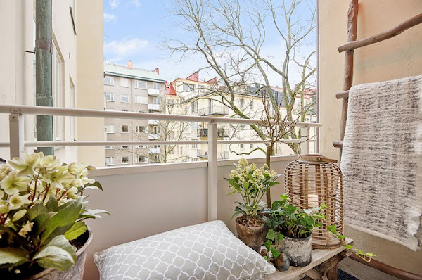 A parte de eso, no hay muebles innecesarios como podéis ver, y cada cosa tiene su sitio, así se consigue una línea limpia y sencilla que hace que la casa parezca mucho más grande de lo que es en sí. En cuanto al balcón, que os voy a decir que no sepáis, me tiene enamorada y con esas macetas y la escalera de madera ya he tenido bastante para que me gustara enseguida.