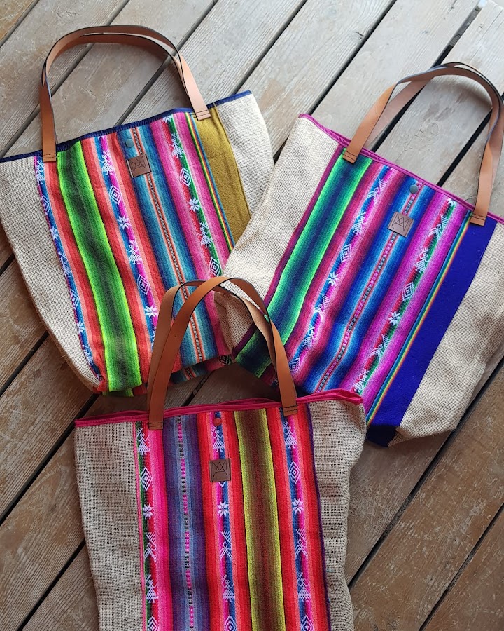 Utiliza todo tipo de telas y tejidos pero principalemnte el AGUAYO y tela de SACO (arpillera)
