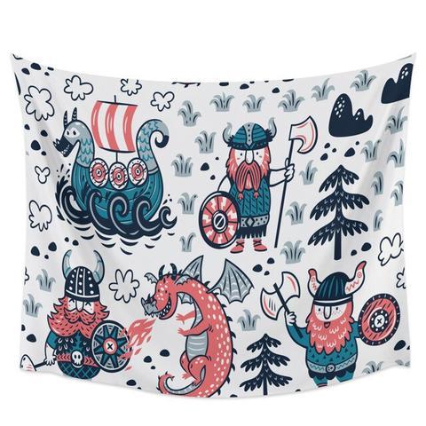 JORMUNGAND. Esta bandera del dragón parece un dibujo infantil y representa al pueblo vikingo. En ella aparecen 3 guerreros, un Drakkar (el barco vikingo) y el monstruo Jormungand. No es una bandera infantil en sí, aunque lo parezca, pero realmente la veo muy bonita para la habitación o cuarto de juegos de los más peques.