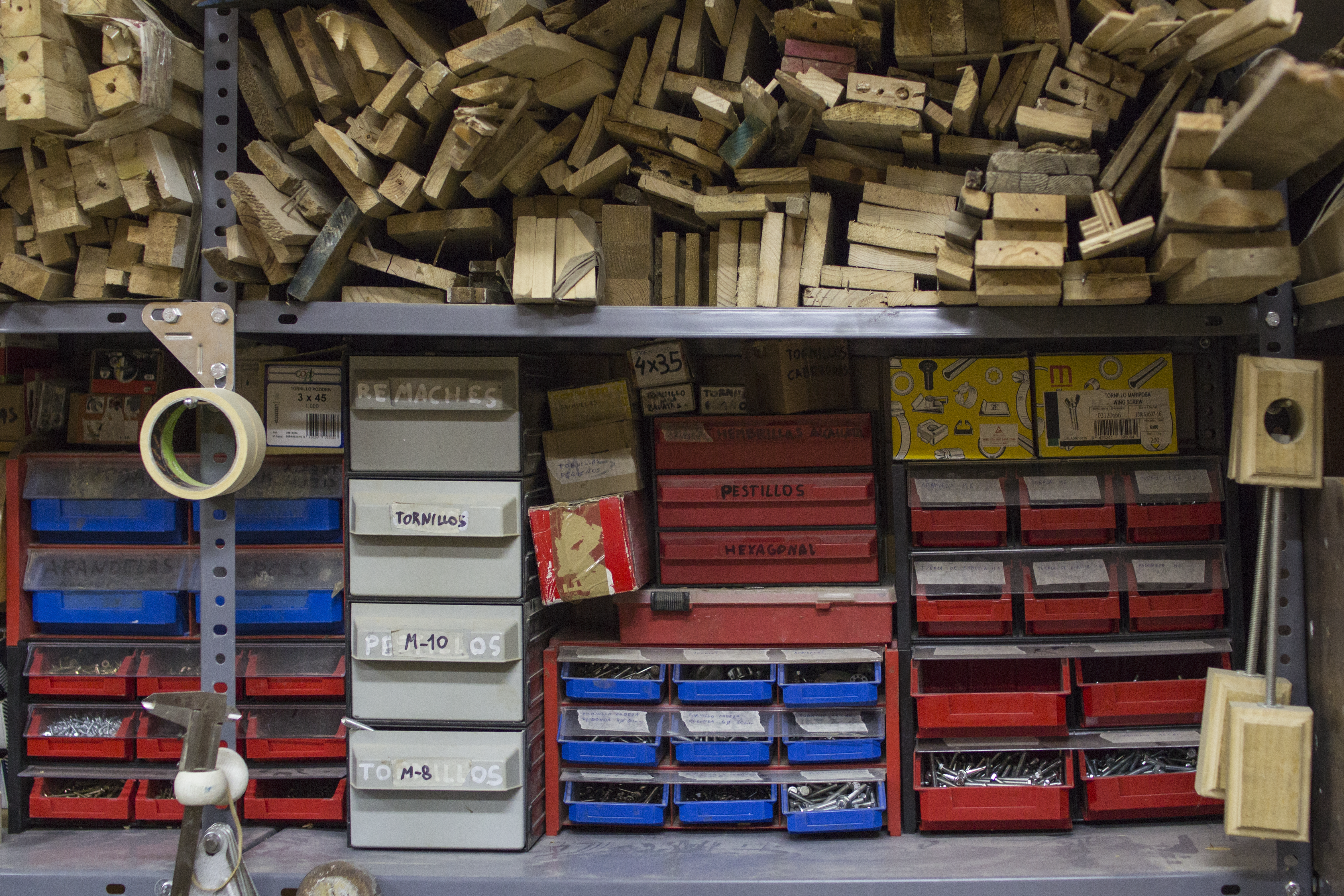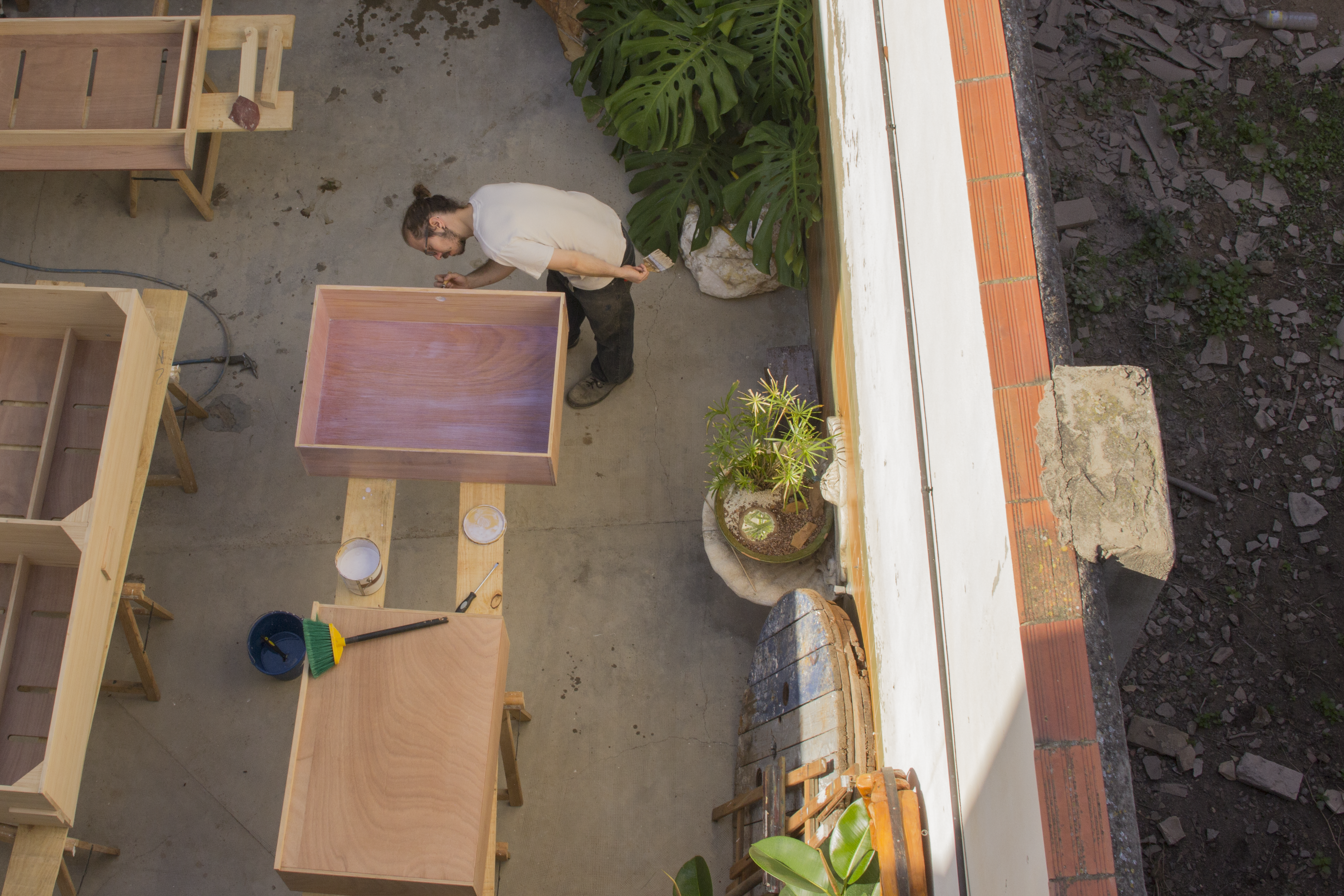 Nuestro proceso de producción, nos acercamos mucho a una forma de trabajar escultórica donde el cómo determina el qué. La rentabilidad es una necesidad ineludible, pero no puede ser el único fin. Trabajamos principalmente con maderas recicladas y las ensamblamos sin tornillería (con cola y varillas de madera). Cuidamos y pensamos cada parte del proceso utilizando materiales de origen natural; saneamos con frío, sales y óxidos, teñimos con tintes y lacas naturales y acabamos con lasur y ceras de elaboración propia. Cada pieza resultante es única e irrepetible.