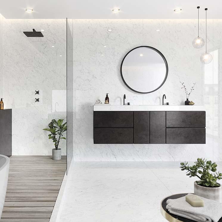 – Una idea interesante para la decoración de tu baño es que los azulejos estén bien juntos, rectificados a tal punto que casi no se perciban las uniones. Esto ayuda a generar un ambiente continuo, de mayor amplitud.– Los muebles flotantes generan una mayor sensación de espacio. Sanitarios o lavamanos que están suspendidos en el aire crean una mejor circulación, y si además los acompañamos con detalles y acabados en madera clara, el resultado es ideal.