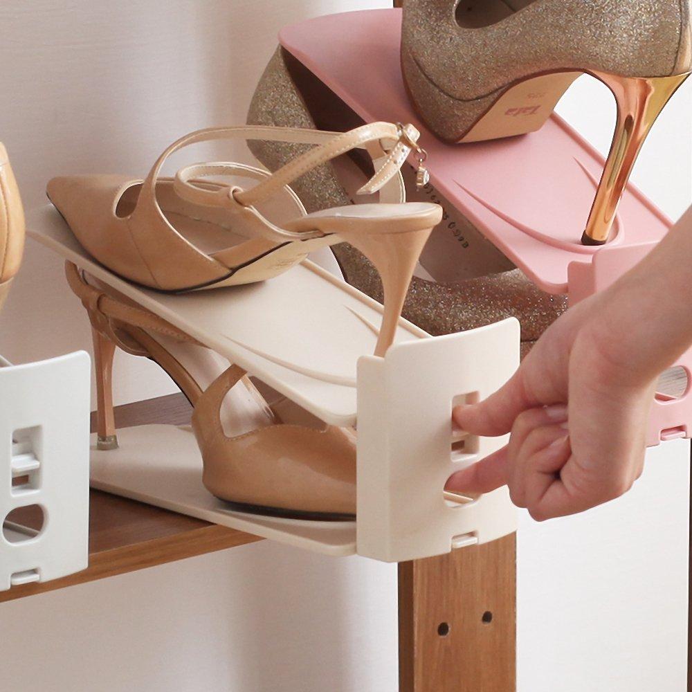 Si te decides por colocarlos directamente sobre baldas aprovecha el espacio colocando los zapatos uno hacía atrás y el otro hacía adelante. Para hacerlo y aprovechar mejor el espacio este tipo de organizadores en tonos suaves. O éstos otros otros organizadores en tono neutro.