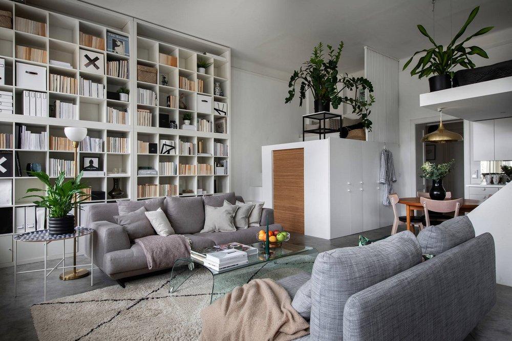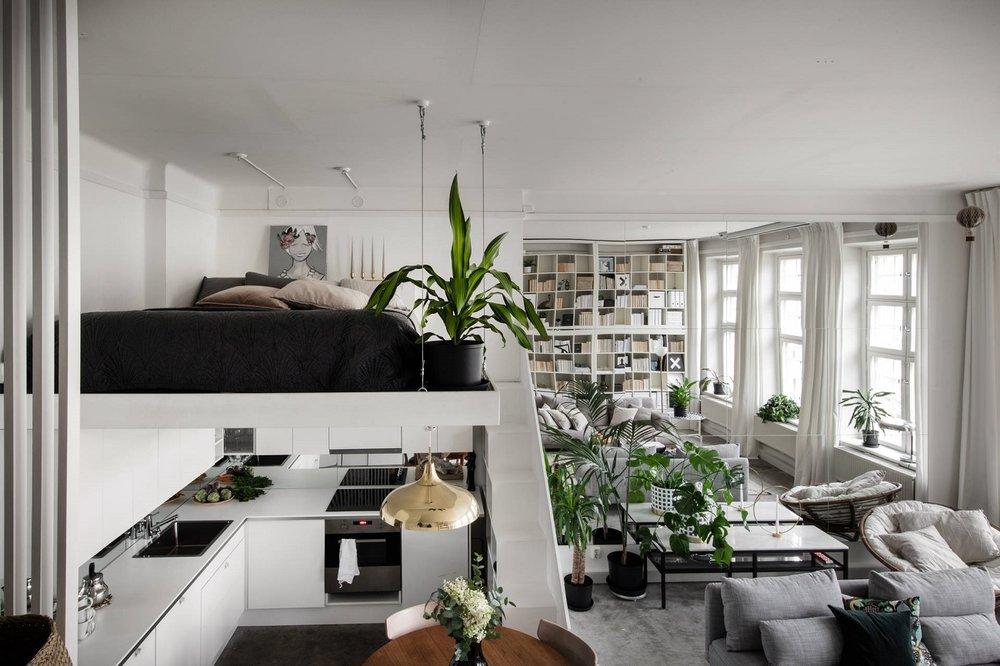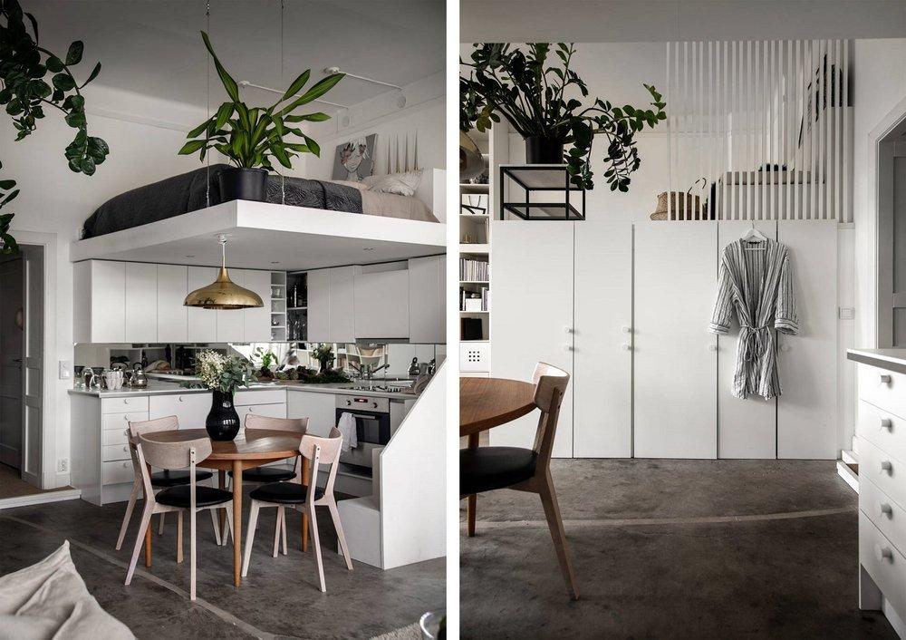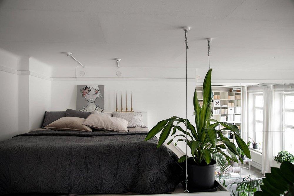 Ahora bien, el hecho de que una habitación sea pequeña no significa que solo debas usar colores naturales, pero creo que el esquema de color monocromo funcionaextremadamente bien en este apartamento y las plantas aportan un poco de color y vitalidad al loft. Me encanta cómo han utilizado la altura para cubrir una pared con los enormes estantes de IKEA Kallax.¡Cada centímetro de este apartamento está bien perfectamente estudiado y me encanta! Inspírate!!!