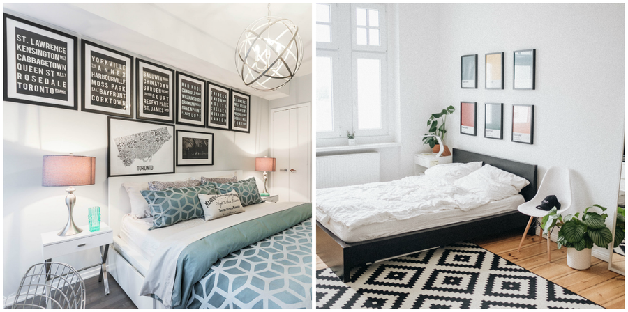 La pared vacía puede dar la impresión de que la decoración de esa estancia no está terminada. ¿Una solución fácil? Opta por los cuadros, podrás combinarlos cómo más te gusten. Aquí puedes ver dos ejemplos, en uno aprovechan la pared de manera horizontal y en el otro de forma vertical. Si quieres transmitir calma, crea una composición simétrica. En cambio, si te gusta el dinamismo, mezcla cuadros de diferentes tamaños.2 en 1: cabecero y estante
