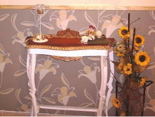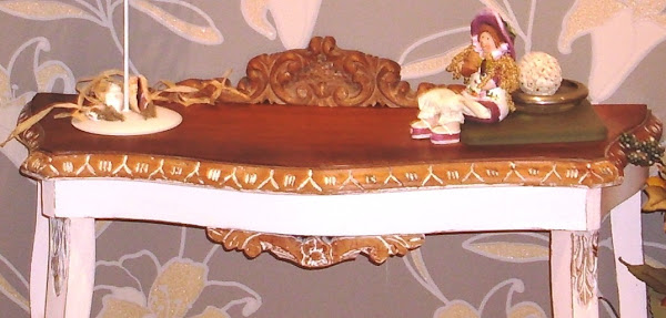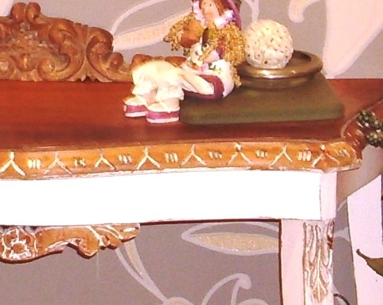 Detalle de la consola y sus molduras. la superior esta tal cual era, solo con una mano de barniz. La frontal esta con una patina en blanco y cepillada, al igual que la de justo debajo, el resto pintado en blanco roto y envejecido por los cantos.