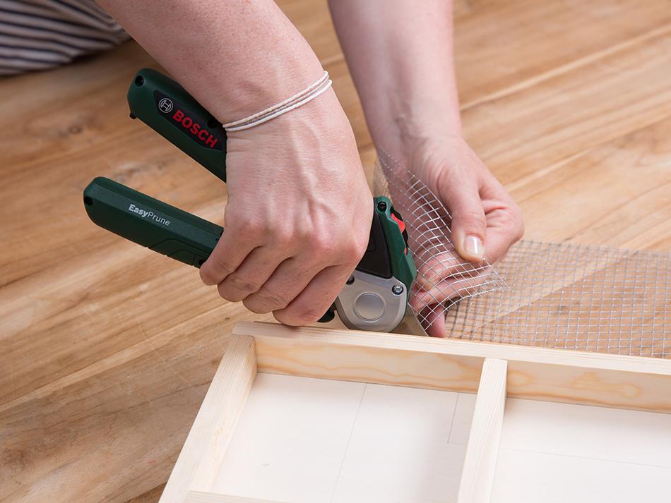 El siguiente paso consiste en grapar la malla de alambre a la trasera de la ventana de madera. Esta red servirá para sujetar las plantas y la tierra del jardín vertical DIY. Recorta la malla sobrante con unas tijeras especiales.