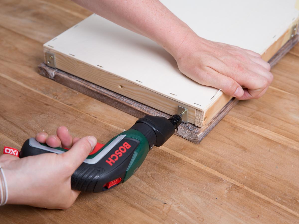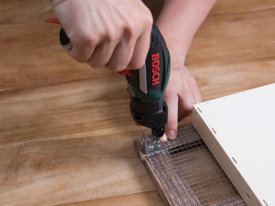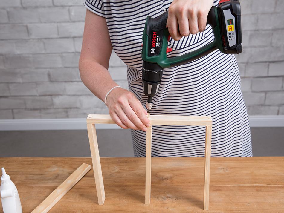 Forma la estructurade tu jardín vertical DIY ensamblando los listones con unos tornillos y el atornillador eléctrico.