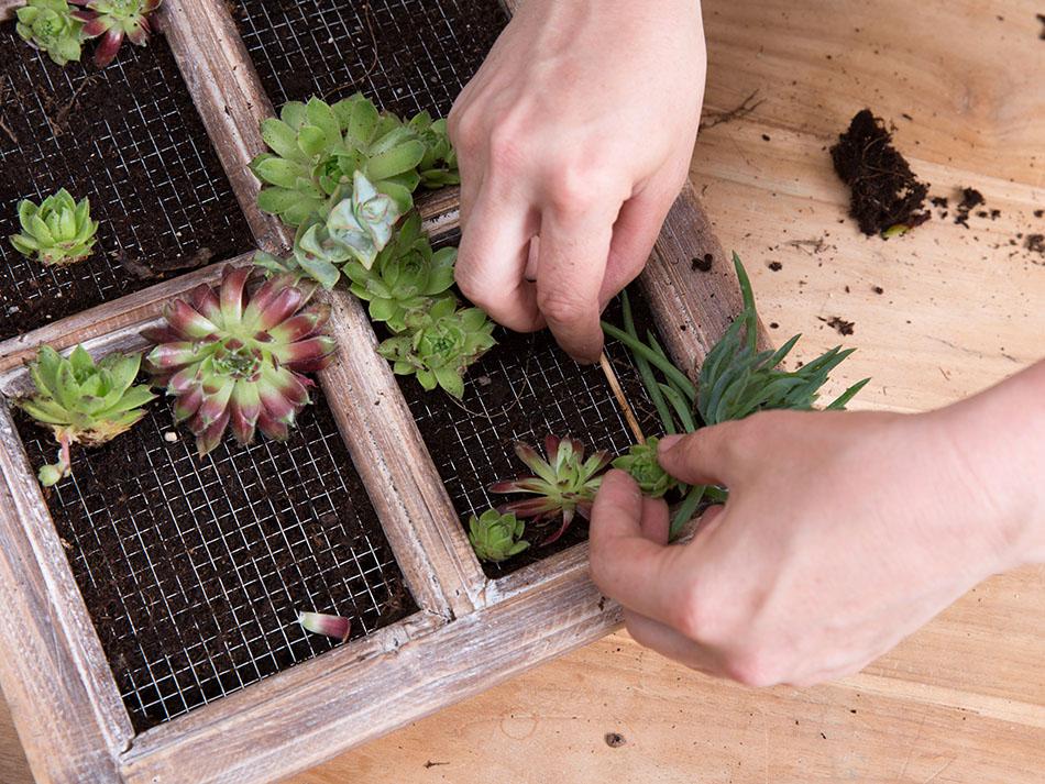 Ya solo tienes que rellenar los huecos interiores con tierra y algunas plantas. Riega bien la tierra y cuelga el jardín en la pared. ¡Ya lo tienes! Un detalle decorativo de lo más natural, fresco y primaveral.