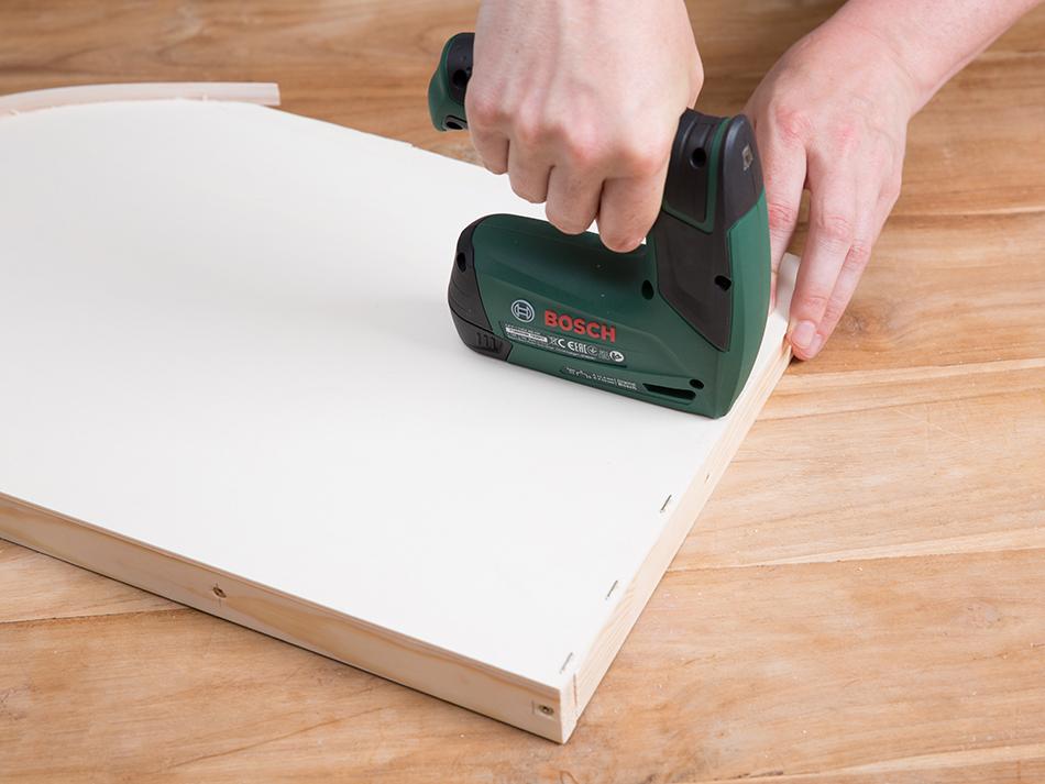 Ahora fija el tablero de contrachapado a la estructura de listones con ayuda de la grapadora. Antes tendrás que cortarlo a la medida utilizando la sierra de calar, pero ya verás que no es una tarea difícil.